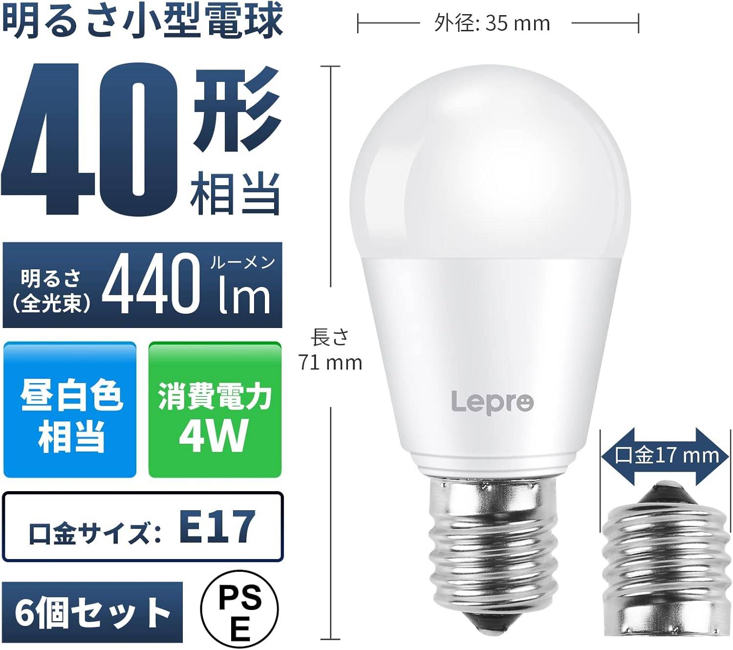 - 【製品仕様】◉口金サイズ:17mm | ◉電球サイズ:直径35mmx高さ71mm | 定格消費電力:4W | 定格電圧:100V 50Hz/60Hz | 全光束:440lm | 色温度:5000K(昼白色相当) | 演色性:Ra80+ | 照射角度:230° | 調光:非調光型(調光器又は調光器具に対応できないことを予めご了承下さい)|【日本PSE認証済み】
