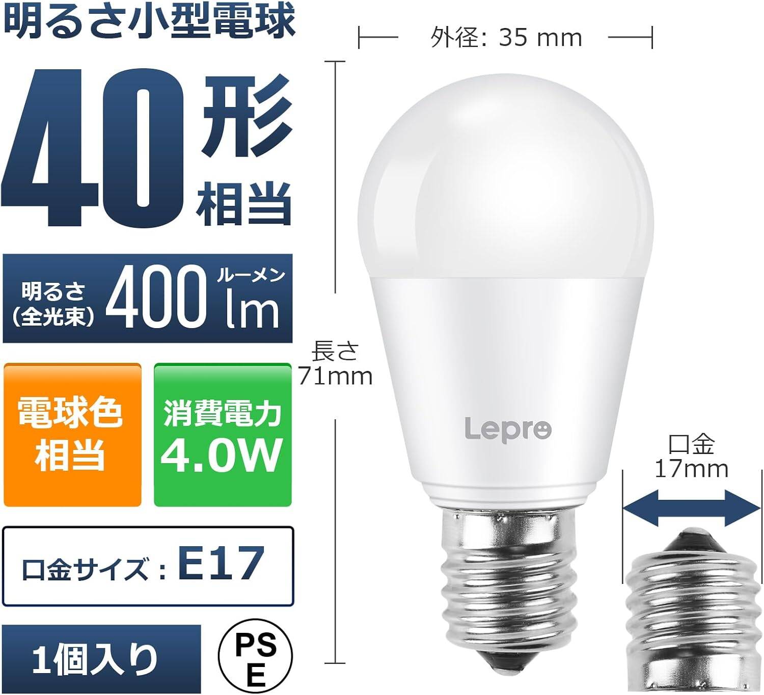 - 【製品仕様】◉口金サイズ:17mm | ◉電球サイズ:直径35mmx高さ71mm | 定格消費電力:4W | 定格電圧:100V 50Hz/60Hz | 全光束:440lm | 色温度:3000K(電球色相当) | 演色性:Ra80+ | 照射角度:230° | 調光:非調光型(調光器又は調光器具に対応できないことを予めご了承下さい)|【日本PSE認証済み】