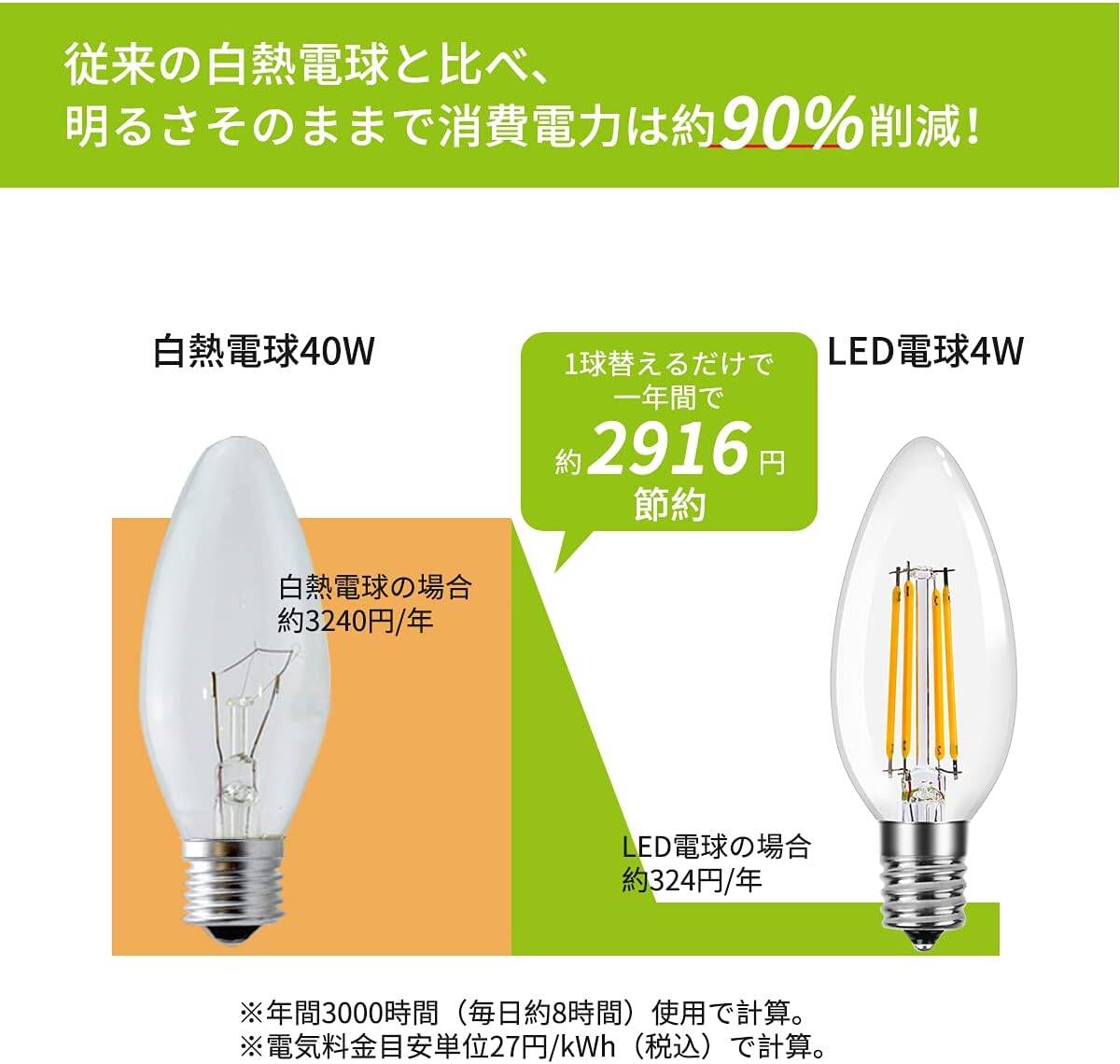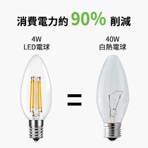 消費電力は僅か4Wで400lm程の明るさがあり、従来の40Wシャンデリア電球と同じ明るさで消費電力は約90%削減できます。