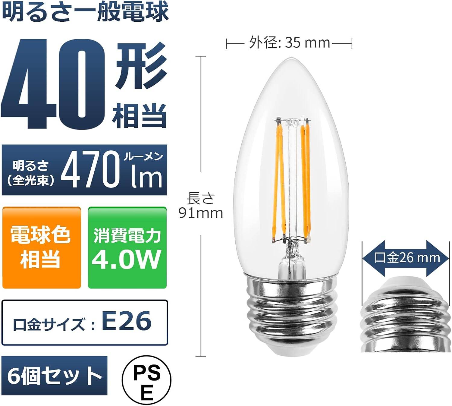 - 【e26シャンデリア風LED電球】◉E26口金 40W形 ◉4W省エネ、白熱電球より90%節電可 ◉全配光・クリアタイプ ◉色温度:2700K電球色 ◉明るさ:470lm ◉Ra>80 ◉口金サイズ:26mm ◉電球サイズ:直径35mm*高さ91mm ◉重量:約14g ◉材質:ガラス ◉定格電圧:100V 50Hz/60Hz