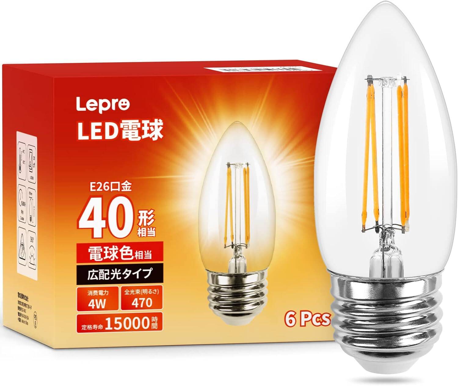 Lepro LED電球 E26 口金 全方向 40W形相当 シャンデリア電球 口金直径26mm C35 電球色 2700K キャンドル電球 フィラメント電球 280° レトロ電球 高演色性 クリアタイプ 密閉器具対応 4W 省エネ チラツキ少ない シャンデリア風 蝋燭型 led照明 日本PSE認証済 6個入り[100008-WW-JP-6]