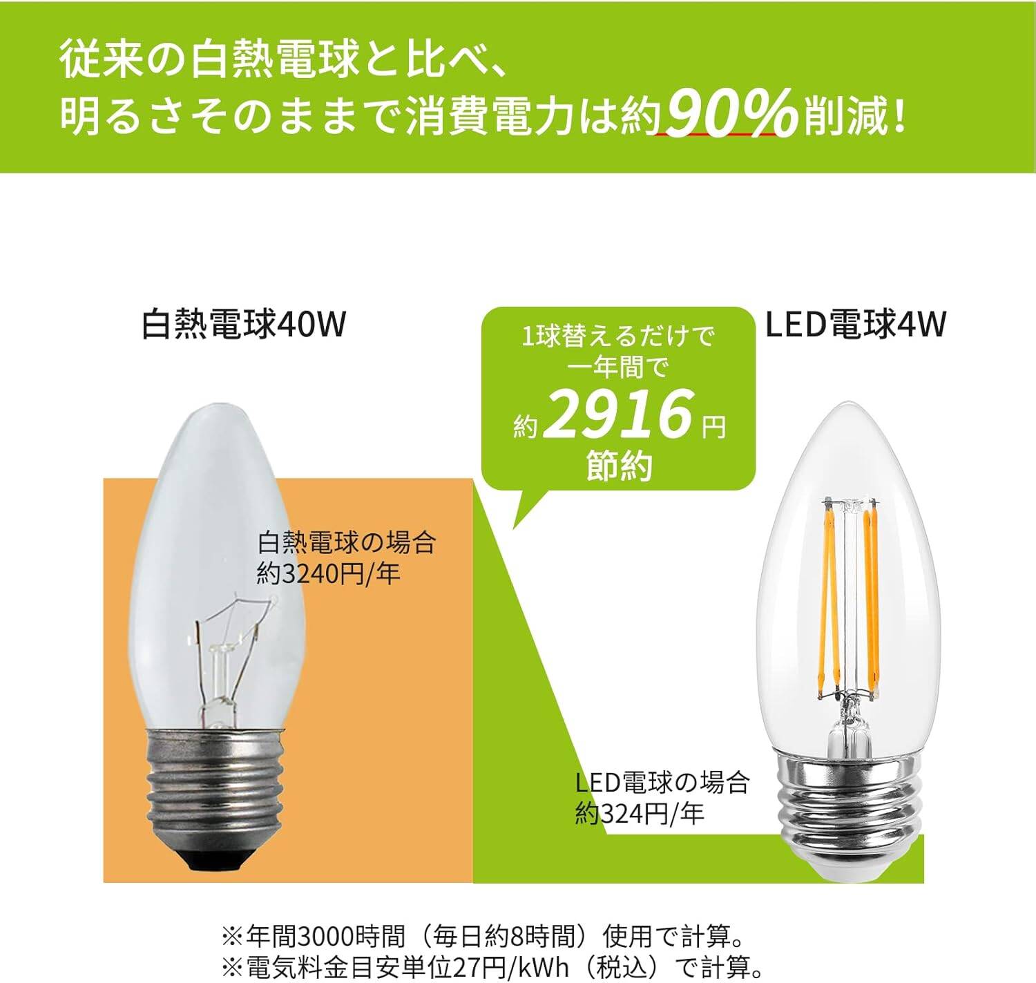 ■ 省エネ:従来の40W白熱電球と比べて、同じ明るさで消費電力は僅か4W、約90%削減できます