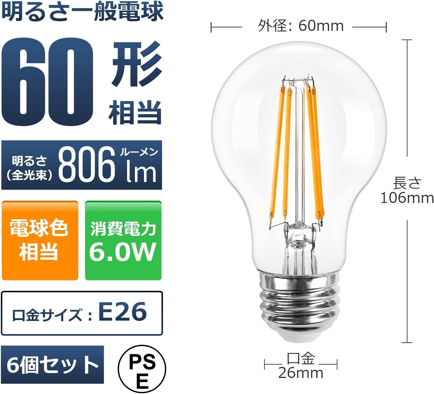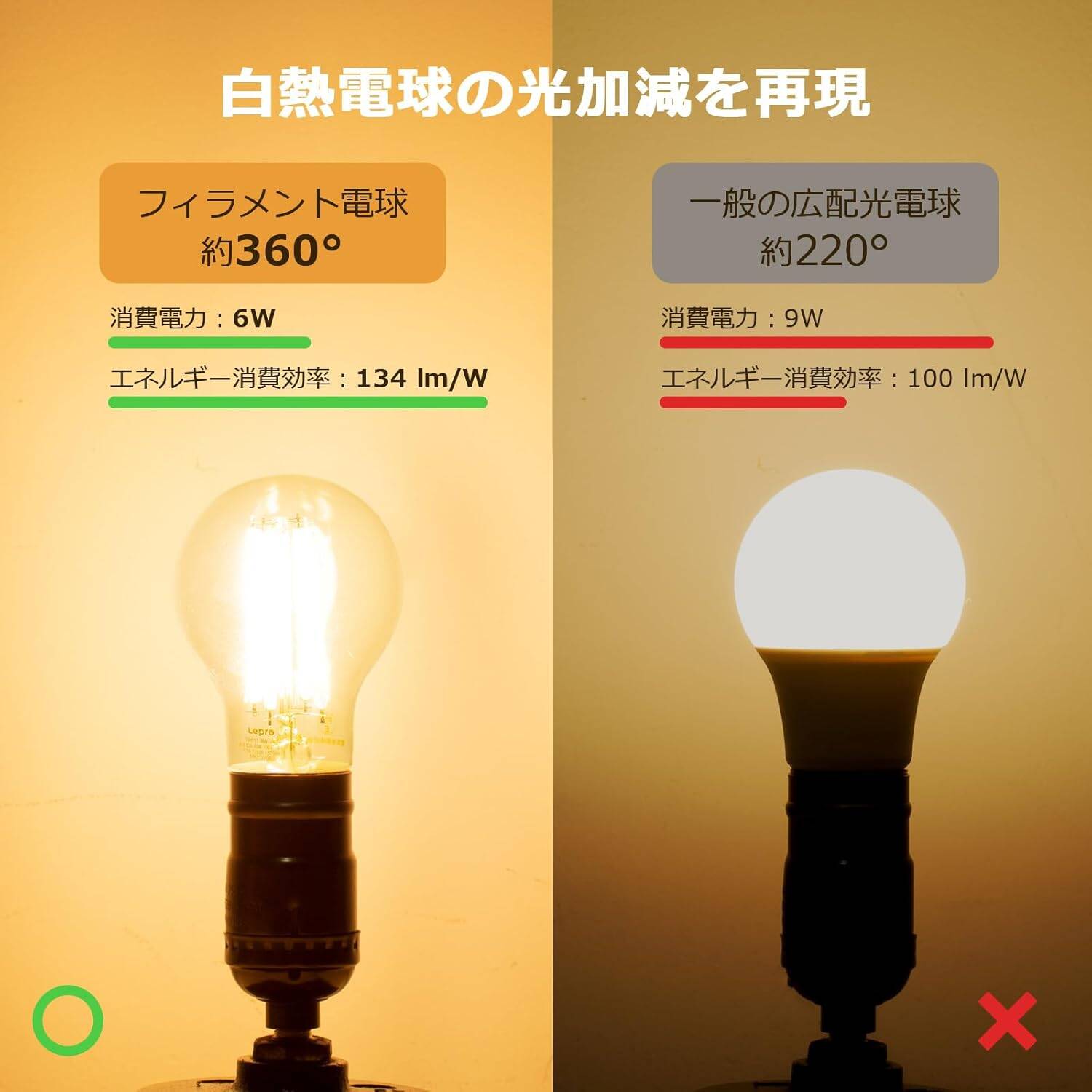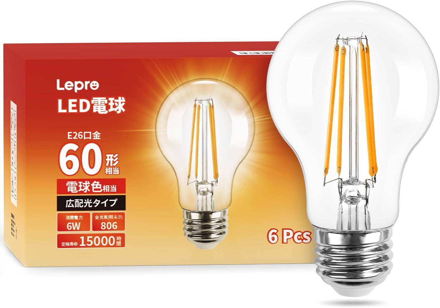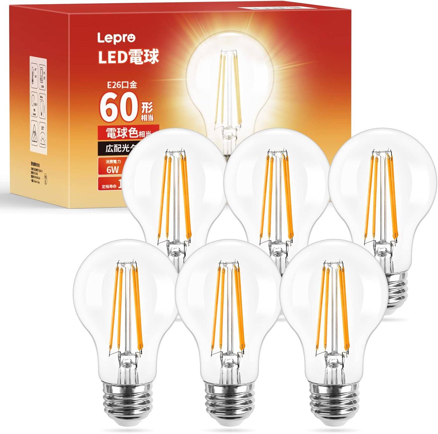 Lepro led電球 e26 led 60W形 電球色 フィラメント 電球 60W 一般電球形 6W 2700K クリアタイプ 非調光 800lm おしゃれ 省エネ PSE認証済み シーリング ペンダント スタンド ブラケット適用 インテリア 装飾用 玄関 階段 廊下 トイレ リビング ダイニング 店舗 レストラン 節電と明るさが両立 6個入り[100010-WW-JP-6]