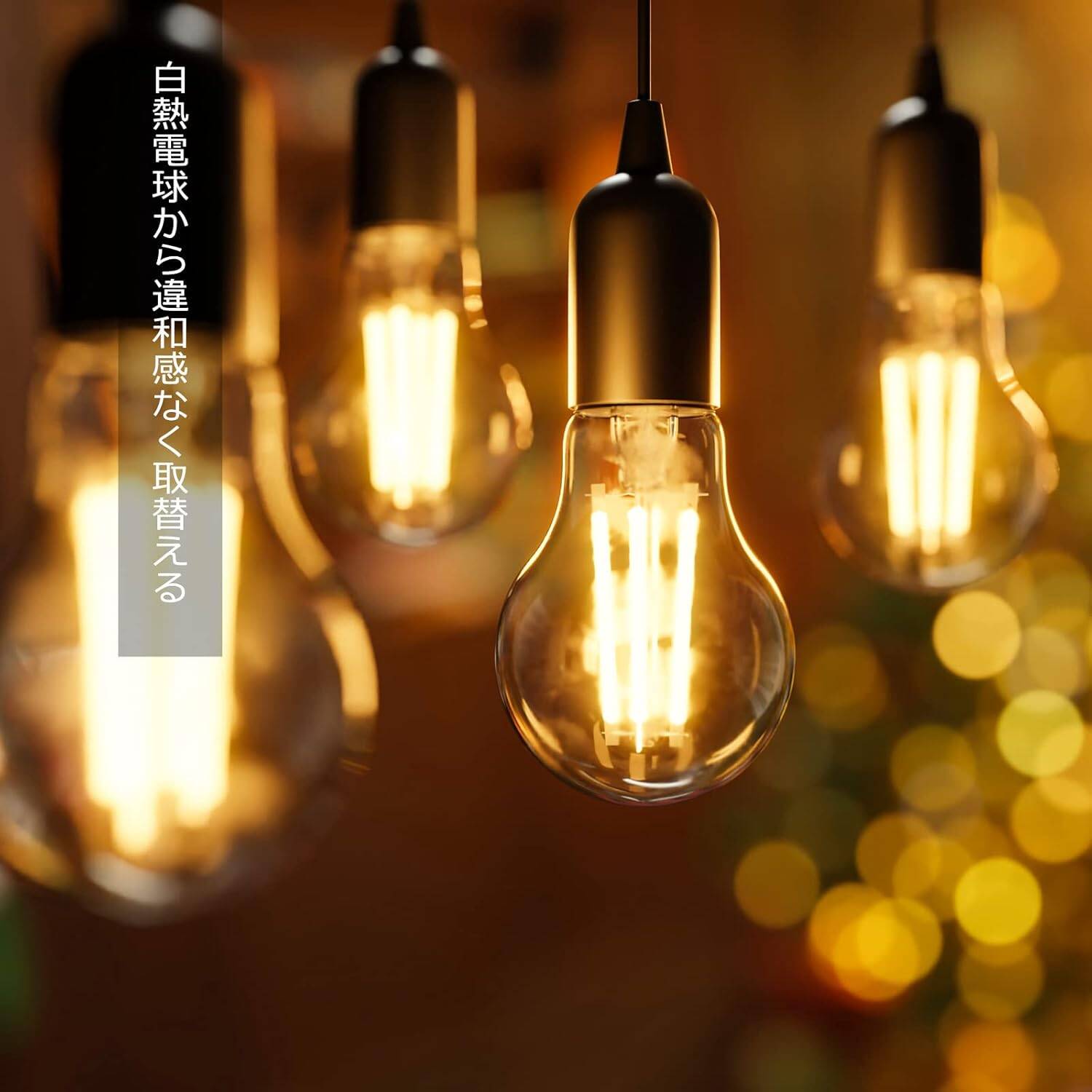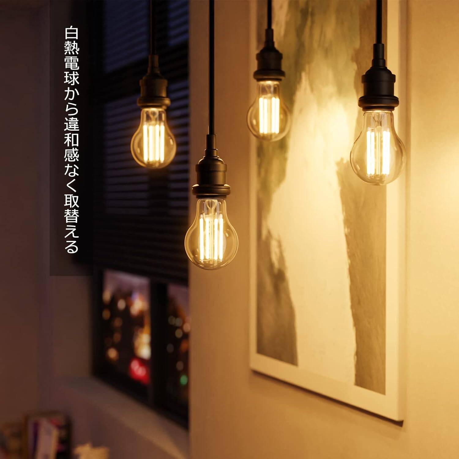 - 【シンプルでリラックスした空間】昔ながらの電球の美しさと質感を保つLED照明を、インテリアにこだわりを持つあなたにお届けします。白熱電球から違和感なく取り替えられ、節電と明るさが両立できる同時に、白熱灯のように熱くはなりません。電球の中からすこしオレンジ色のフィラメントが見えるのでおしゃれ。リラックスした空間を作り出すのにぴったりのLED電球で、お気に入りの照明器具に取り付けるだけでレトロな雰囲気に