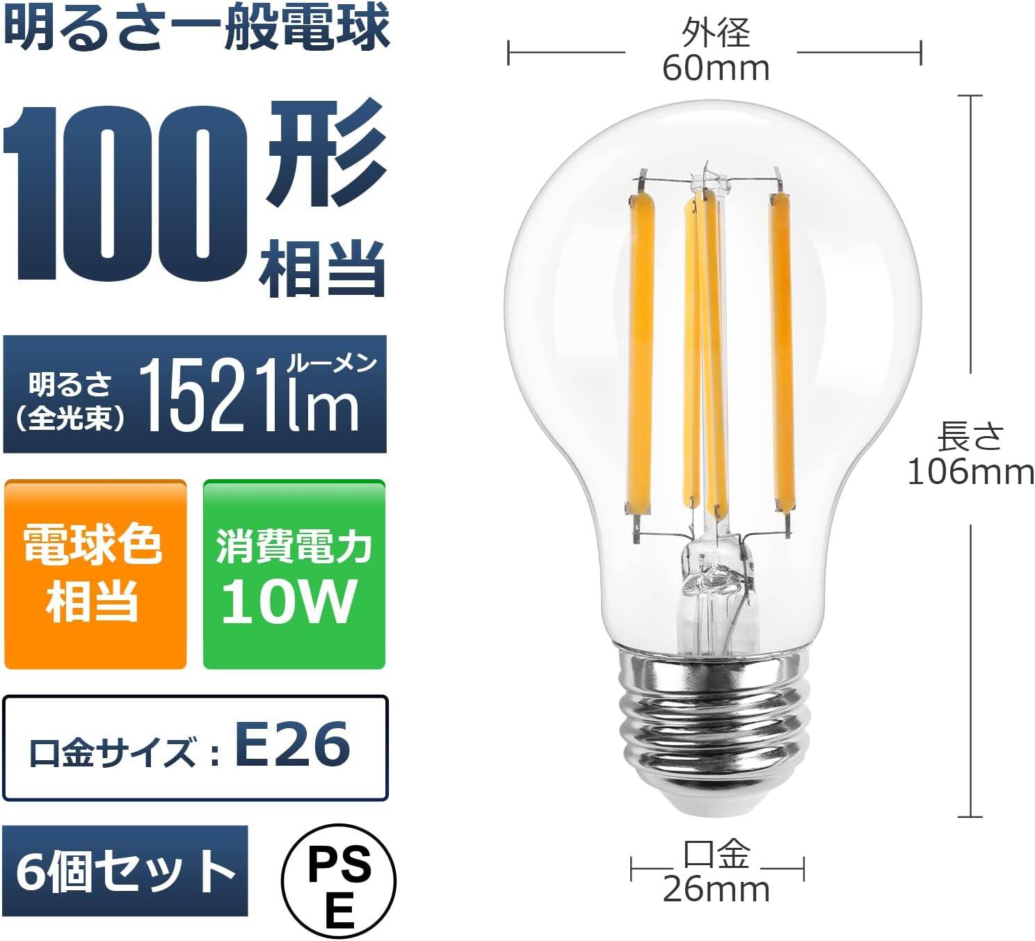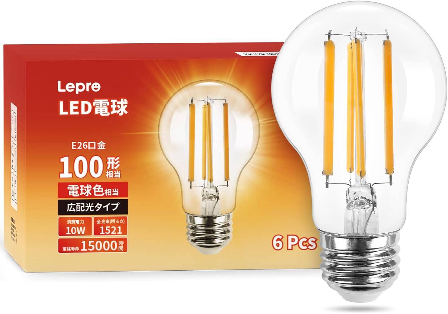 Lepro led電球 e26 led 電球色 100w形 フィラメント 電球 電球色 2700k 10.5w 全方向 クリアタイプ 非調光 一般電球形 1521lm 省エネ PSE認証済み シーリング ペンダント スタンド ブラケットなど適用 インテリア 玄関 階段 廊下 トイレ リビング ダイニング 6個入り[100011-WW-JP-6]