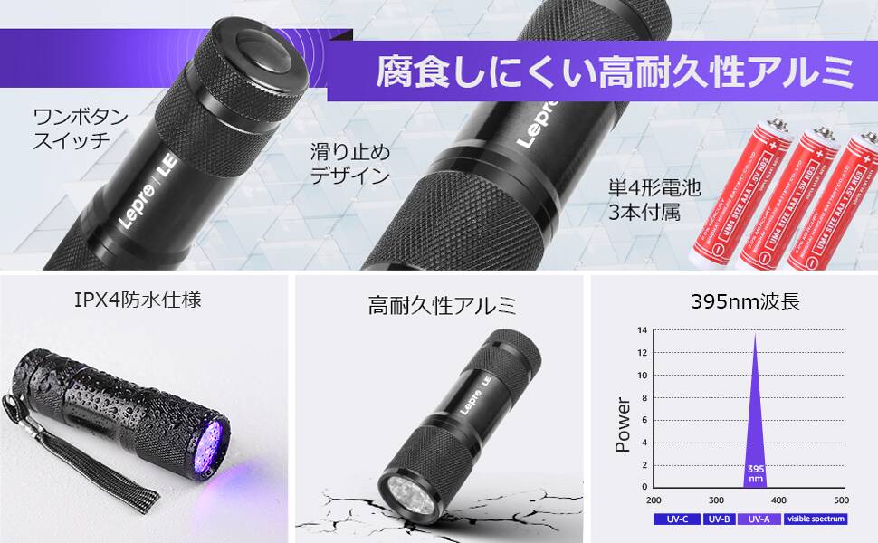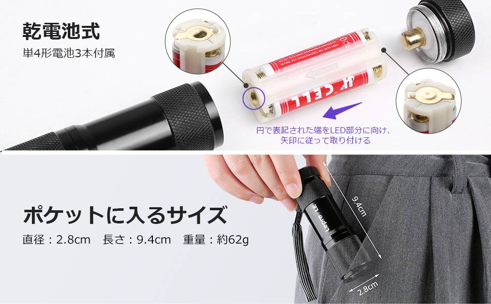 - 【取扱上の注意】Leproブラックライトには単4形電池が3本付属しており、お手元に届き次第ご利用いただけます。●電池を電池パックに取り付ける際は、電池パックの両端にあるプラス極とマイナス極の指示に従ってください。●電池パックを本体に取り付ける際は、電池パックの矢印がLED部分の方向を向くように装着してください。