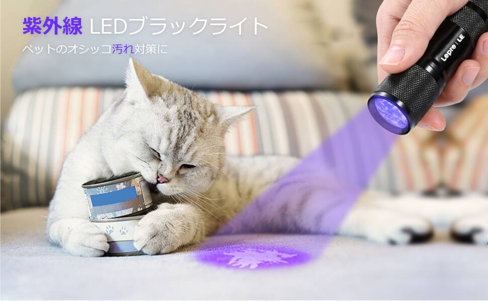 - 【ブラックライト:目に見えない汚れを発見】ペットや人間のオシッコ、尿のしずく、吐瀉物、油汚れなど、肉眼では見えない汚れを簡単に検出可能で、徹底的に汚れを除去できるため、お掃除の強力なアシスタントになります。ペットや子供がいる家庭にお勧めです。※ご注意:本製品はUVライトですので、通常の懐中電灯として使用することはできません。