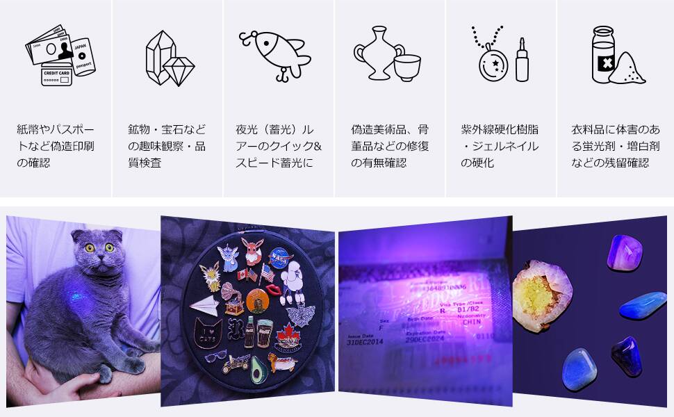 - 【様々なシーンで活躍】紫外線ライトを使用し、赤ちゃんの衣類の付着した汚れを見分ける、衣類に残留した蛍光剤を検出、UVレジンの硬化、釣り用常夜灯、偽造印刷物の鑑定、郵便検査、精密機器の粉塵検査、歯科診察、機械のオイル漏れ点検など、幅広くご活用いただけます。