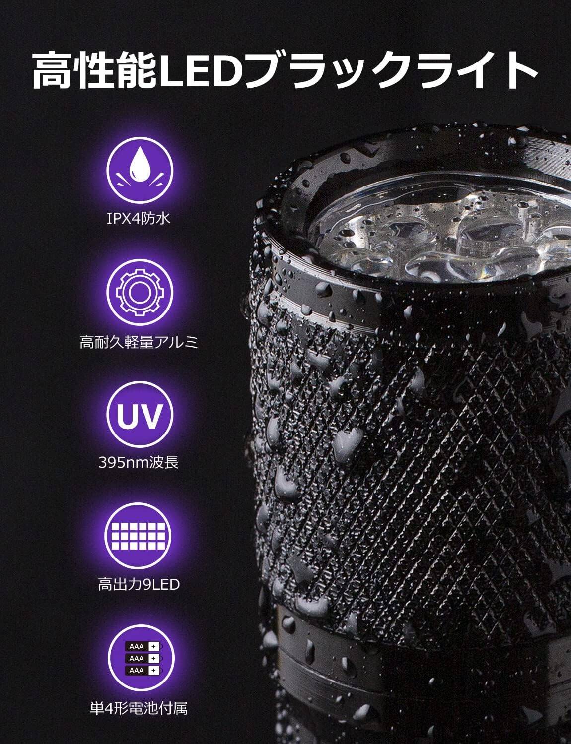 本製品は紫外線ライトであり、通常のLED懐中電灯のような明るさは期待できません。あらかじめご了承ください。
