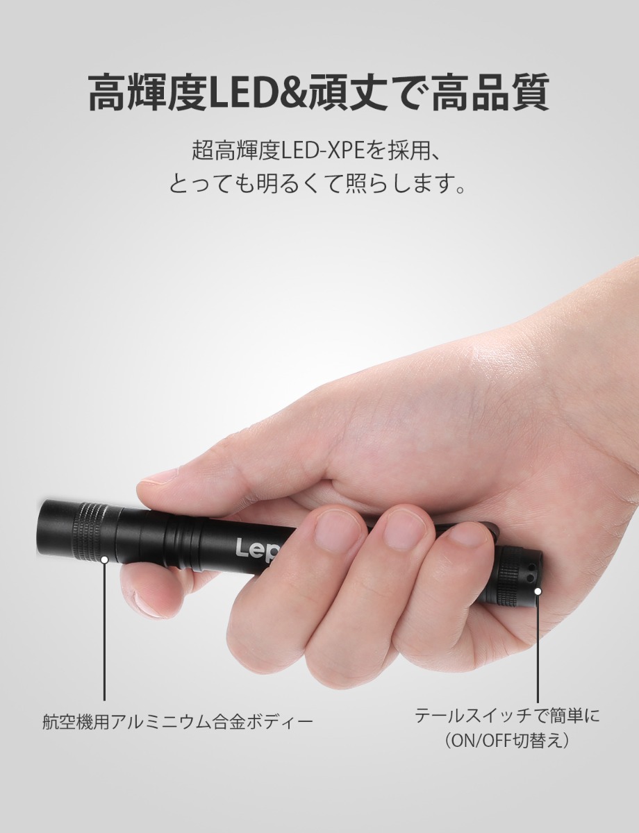 - 【三段階調光】ハイ・ロー・SOSという3つ点灯モードが備え、テールスイッチを押すと切り替えます。2本の単四電池(別売り)で実用点灯は約8時間となります。