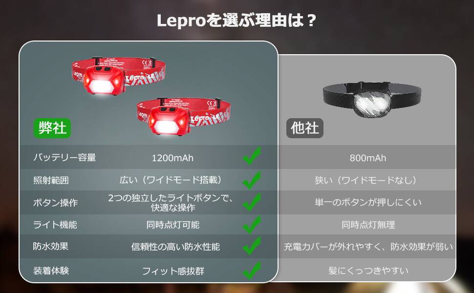 - 【安全・安心使用&パッケージ内容】ヘッドライトはCEとROHSの認証済みなので、より安心してご利用いただけます。パッケージ内容:LEDヘッドライト(レッド)*2、USB-C充電ケーブル*2、取扱説明書*1。