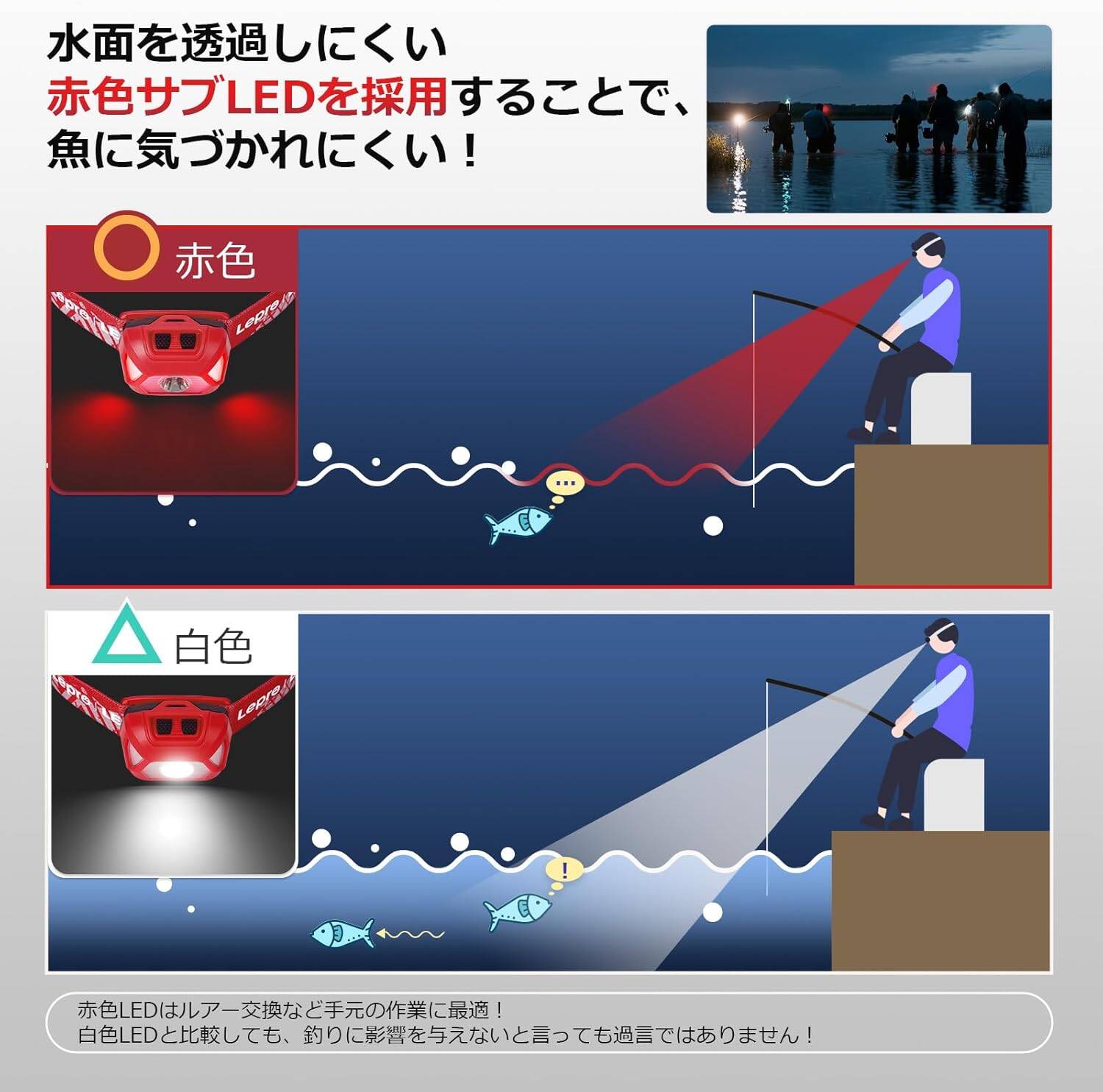 - 【スポット・ワイドビール・赤色サブLED切替】スポットモード:High/4時間点灯、Low/12時間点灯。ワイドモード:High/10時間点灯、Low/15時間点灯。赤色LEDモード:赤色点灯とSOS赤緑点滅/15時間点灯。赤色LEDライトは魚が警戒されにくく、夜釣りには最適です。また、雨・霧などの悪天候でも視認性が良く、遠くからでも確認しやすくなり、事故防止に役立ちます。