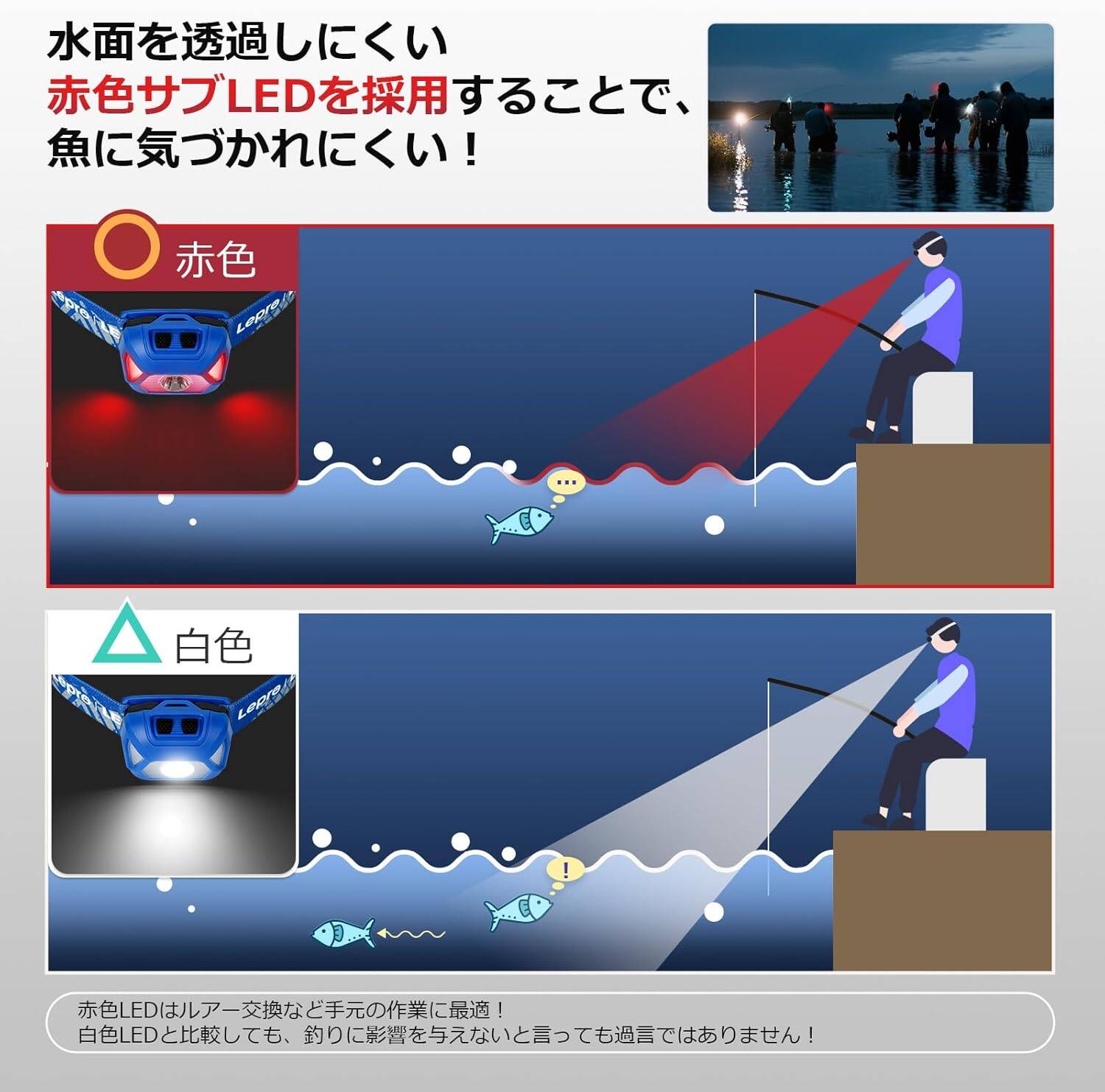 - 【スポット・ワイドビール・赤色サブLED切替】スポットモード:High/6時間点灯、Low/19時間点灯。ワイドモード:High/7時間点灯、Low/22時間点灯。赤色LEDモード:赤色点灯とSOS赤緑点滅/22時間点灯。赤色LEDライトで魚は警戒する事なく釣れます。雨・霧などの悪天候でも視認性が良く、遠くからでも確認しやすくなり、事故防止に役立ちます。