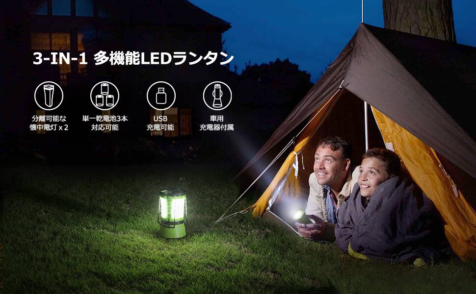 - 【LEDランタンと2個の懐中電灯が一つに、防災グッズとしてもオススメ!】ランタンと着脱式の懐中電灯2個がひとつになった3-in-1充電式ランタンが登場しました。食卓用のメインランタンとして使用しつつ、手持ち用に懐中電灯を取り外して使えるので、キャンプサイトからトイレに移動する際などに便利です。ランタン一台を、家族皆で使えます。