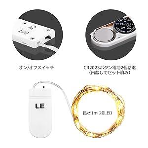 - 【電池式・様々な場所に大活躍】銅線ワイヤーにコンパクトな電池ケースが付いており、持ち歩きにも便利で、お好きなところでご利用可能。ボタン電池(付属)で給電。その上部に設置してある電源スイッチにて簡単操作可能。ガーデン・玄関・庭・壁・舞台・結婚式・パーティー・披露宴などに手軽にご使用いただけます。ハロウィン、クリスマス、新年、祭り、商店街、告白、ハウス、ホテル、バー、学校、ショッピングモールなどの装飾としても大活躍。