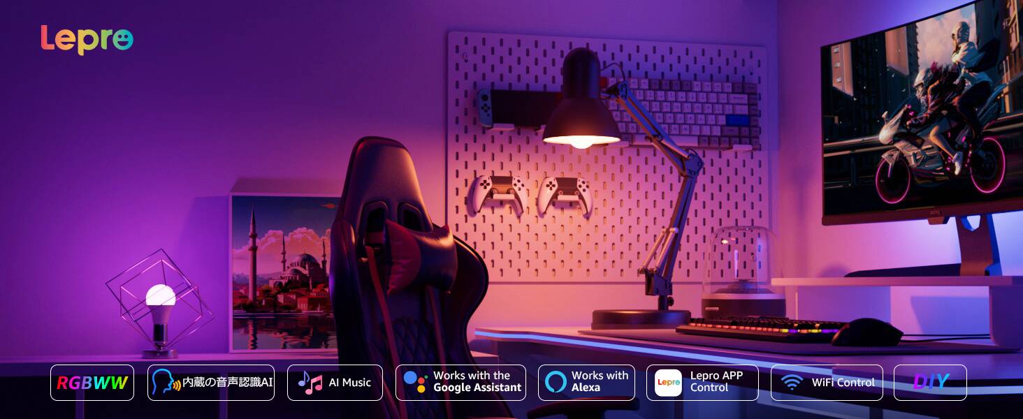 ※Alexaの音声操作は簡単な指示のみ対応します。「AI照明効果デザイン」を利用するためには、「Lepro APP」内蔵の音声認識機能をご使用ください。