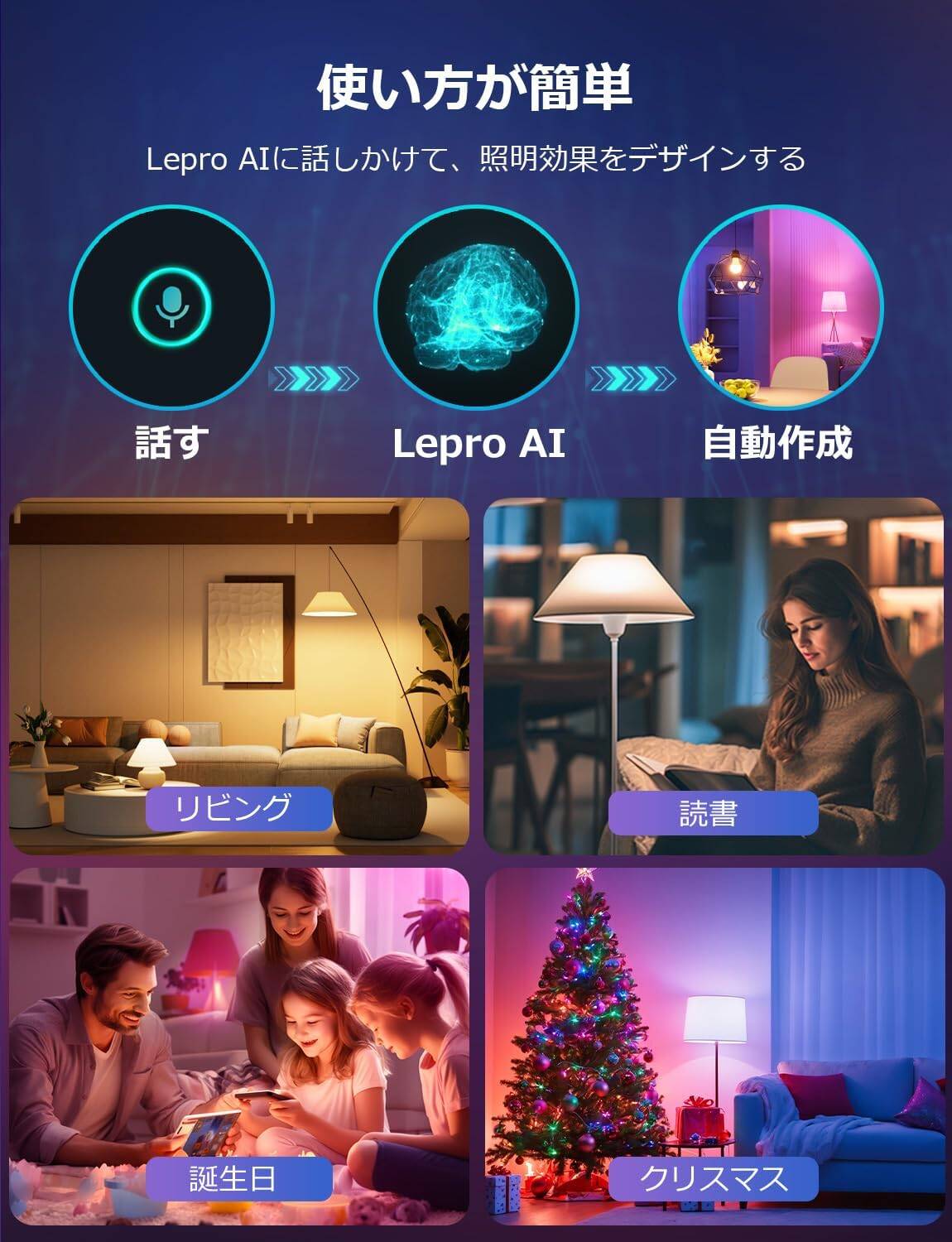 - 【使い方が簡単-内蔵の音声認識で照明効果を生成】アプリ「Lepro」には新開発の対話型生成AIが組み込まれており、音声コマンドでON/OFF、調光調色、動的効果などの調整ができます。さらに、Lepro AIに話しかけることで、AIが何千兆もの照明効果と色の組み合わせから最適なものを提案します。例えば、「クリスマス/読書したい/リラックスしたい/パーティーしよう」などの指示もAIによって最適な照明効果がデザインされます。高効率・簡単なやり取りで、すっきりした簡潔な照明体験をお楽しみください。