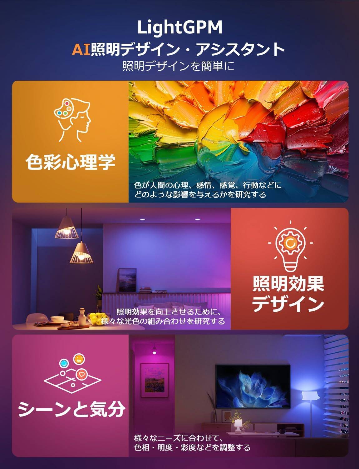 | 照明効果: | AI生成ーLightGPMは色彩心理学や照明効果デザインの知識を活用して、お客様にとって最適な雰囲気を作り出します。 |