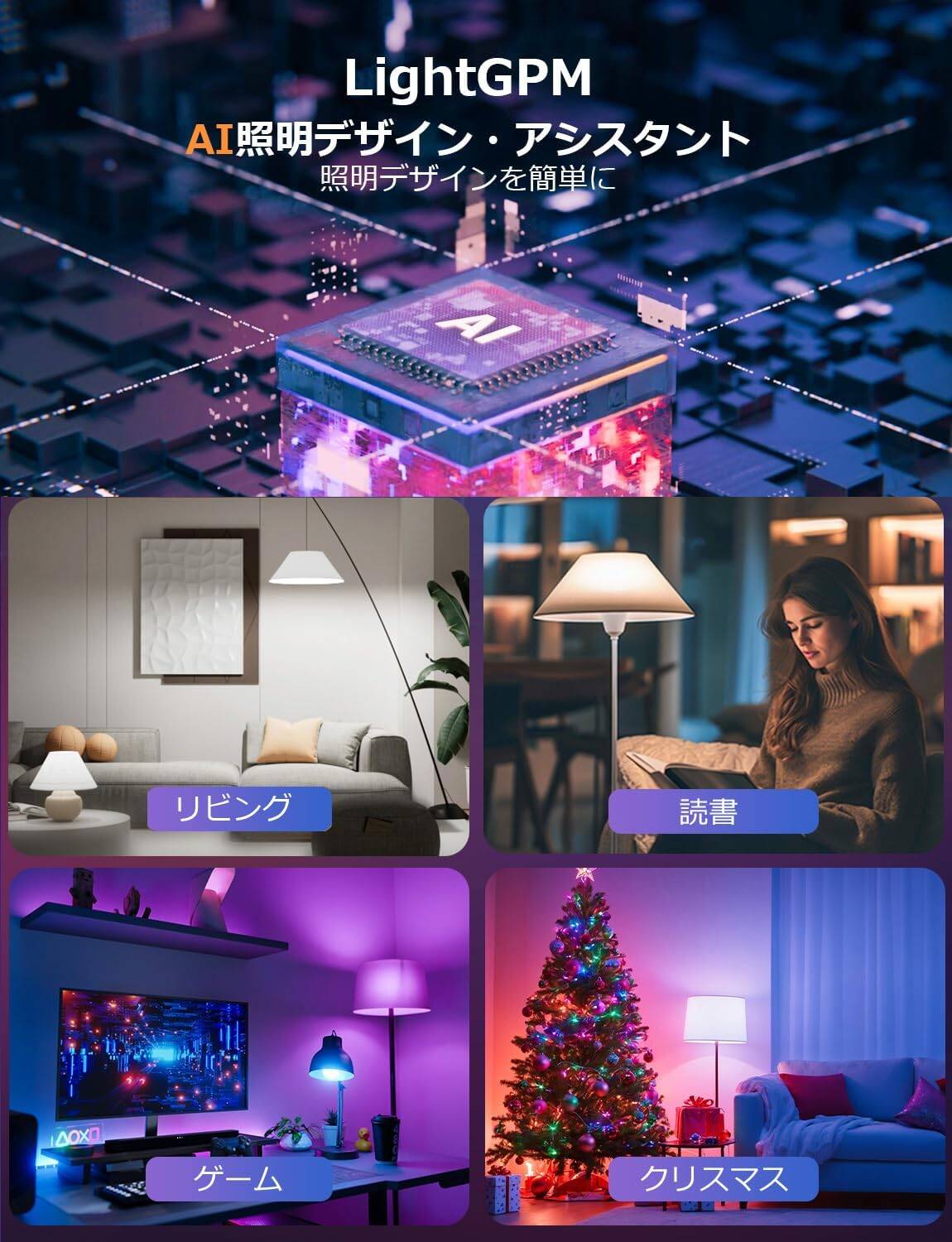 例えば、クリスマス、パーティー、誕生日、ハロウィン、雰囲気作りなど様々な場面で利用できます。さらに、AI機能で動的照明効果も簡単に設定できます。