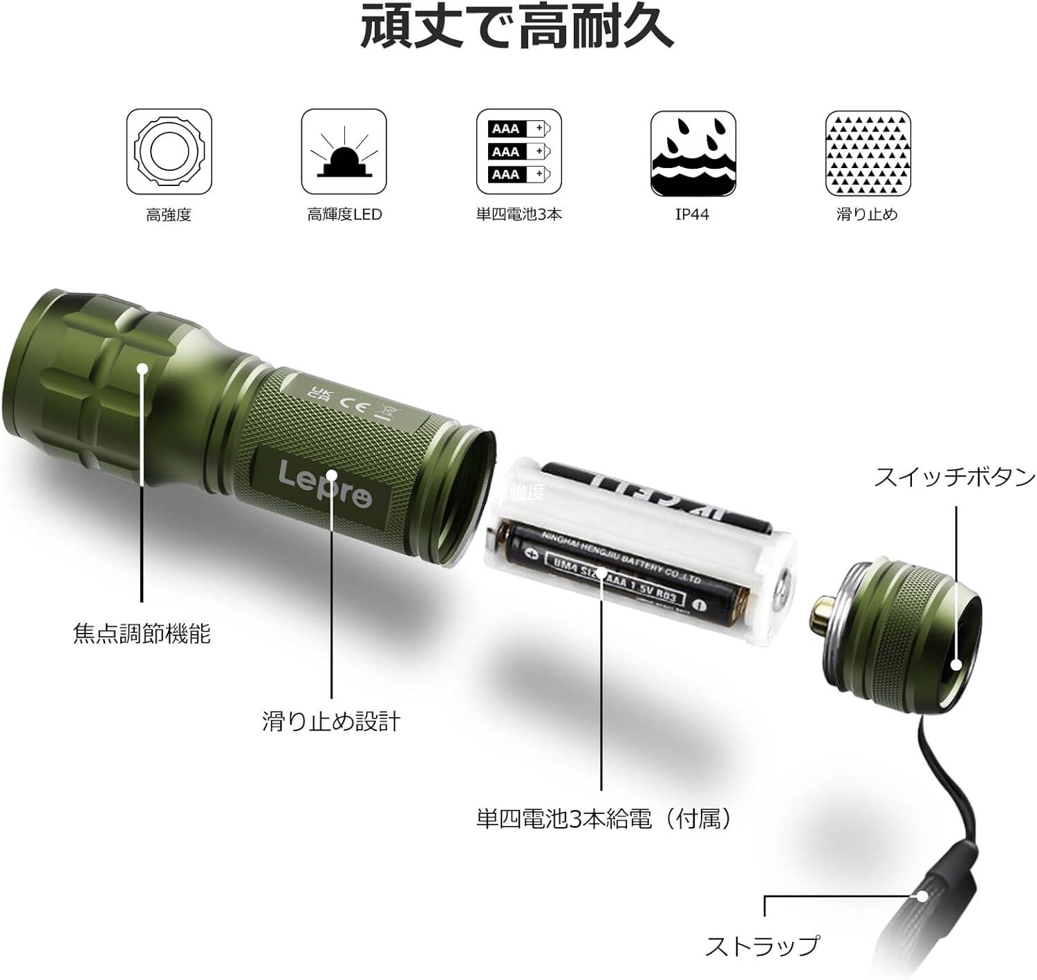- 【電池式懐中電灯】単四電池3本付属(別途購入不要)。お手元に届き次第すぐにご利用可能。夜のペットの散歩やウォーキング、警備の見回り、夜釣り、キャンプ、登山、アウトドア、停電、非常灯など様々な場面で使用可能です。