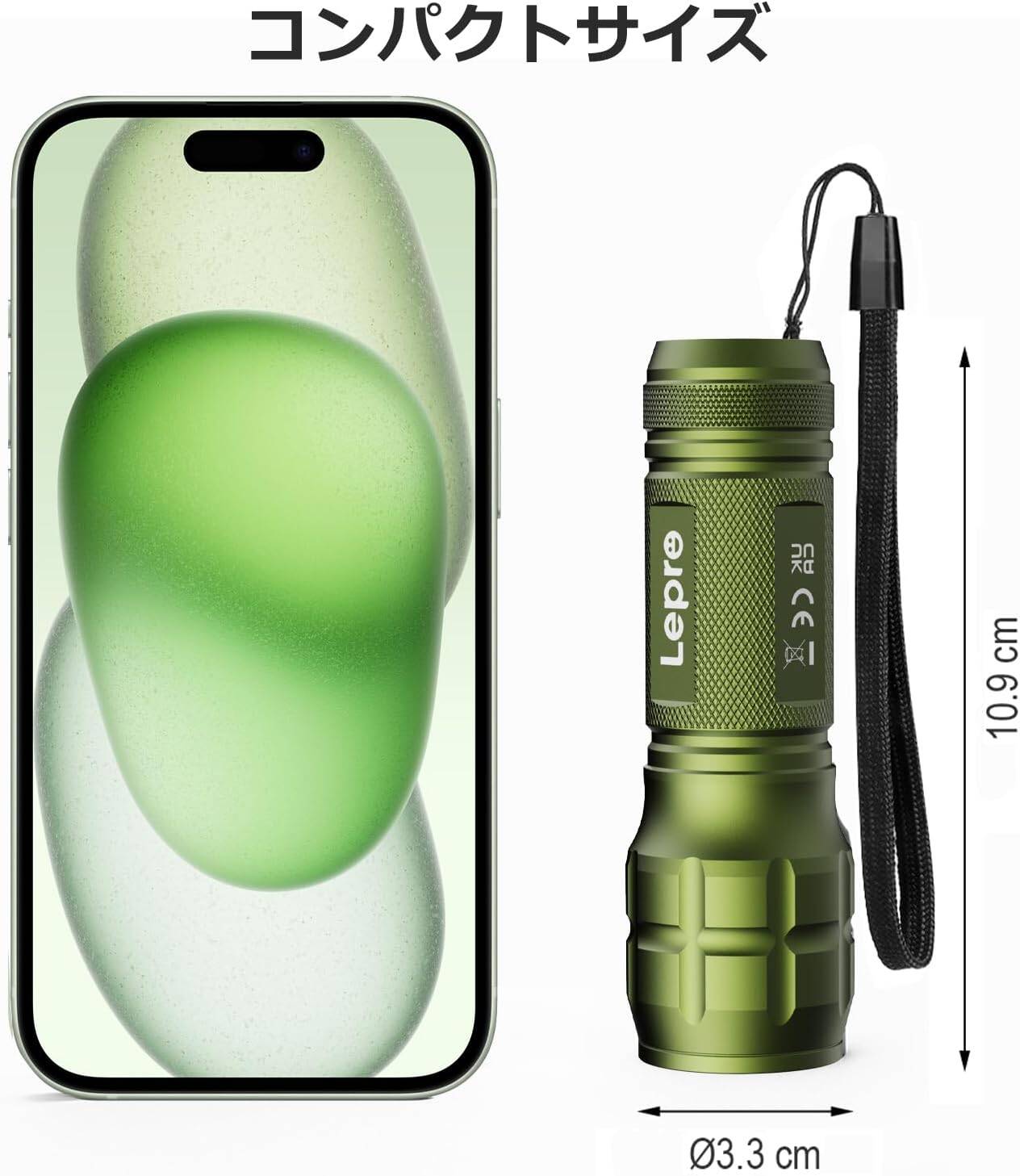 この懐中電灯は、通常サイズのスマホよりもコンパクトな小型LEDライトです。直径3.3cmと長さ10.9cmという非常にコンパクトなサイズなのに明るいです。加えてループ付きとなっており、カバンや手首にぶら下げることで、両手を解放しながら持ち運べるのも魅力。 ポケットに入るサイズ感でどこにでも持ち歩きやすいため、「夜道を歩く際に1つはLEDライトを持っておきたい」という方に人気です。特にキャンプ・登山・夜釣り・夜のペットの散歩・ジョギング・アウトドア・防犯・緊急用などに大活躍。