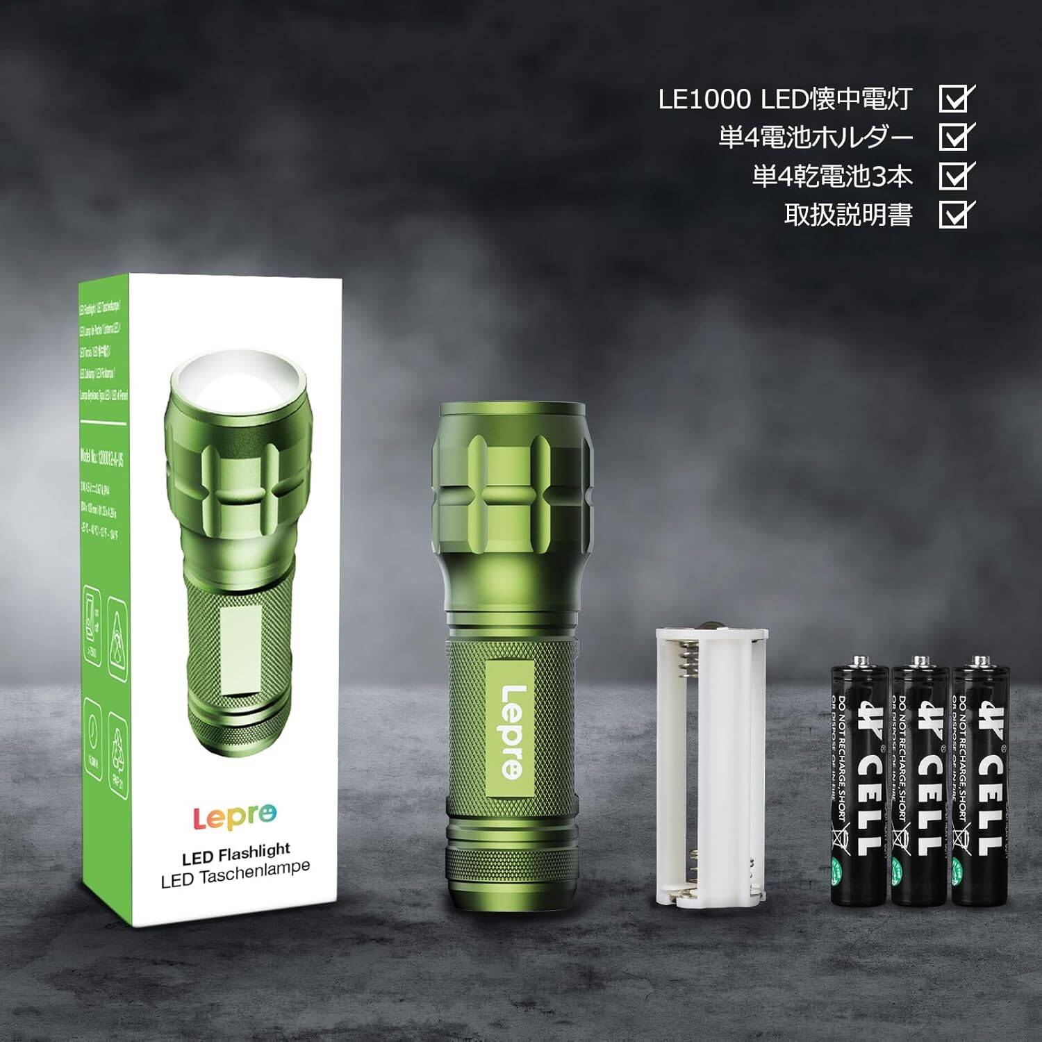パッケージ内容:LED懐中電灯*1 |単4電池ホルダー*1 (懐中電灯にセット済み)|単四乾電池*3|取扱説明書