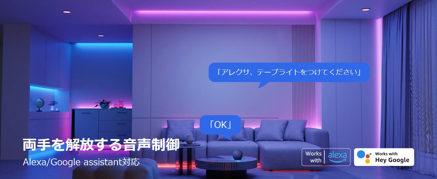 Amazon Alexa、Google Homeと接続することにより、音声コントロールも可能となります。手が離せない時でも、簡単な音声コマンドで、希望の色、明るさ、照明効果を自由に指定することができますので、より便利でスマートなライフスタイルを実現します。