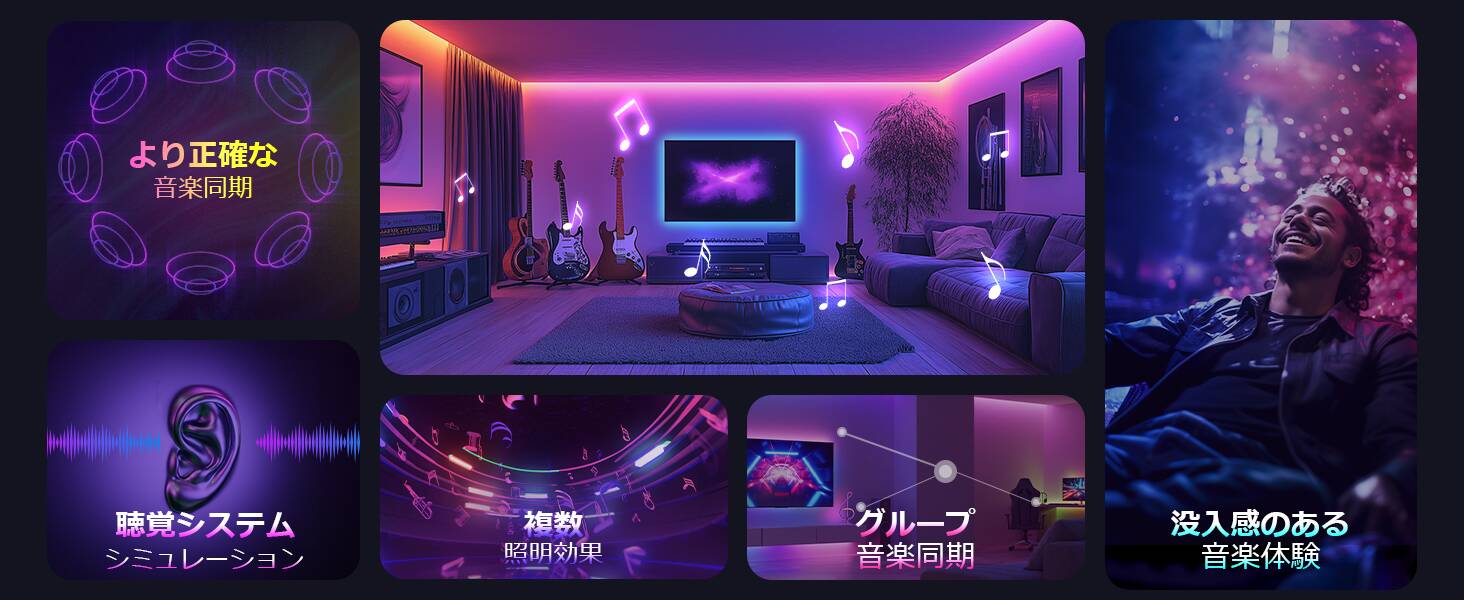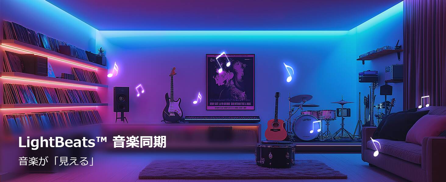 - 【LightBeats音楽同期-音楽が「見える」】:Lepro LightGPMテープライトの音楽同期機能は、スマートフォンの内蔵マイクで音を拾い、音楽のリズムに合わせて光が踊ります。聴覚を視覚のスペクタクルに変換し、音楽とライトの一体感をお楽しみ、パーティーやリラックスタイムをより楽しく演出しましょう。また、AIはゲームや映画やLiveの音を自動解析して、LEDライトの明るさと色を自動的にコントロールし、今までにない没入感を演出します。