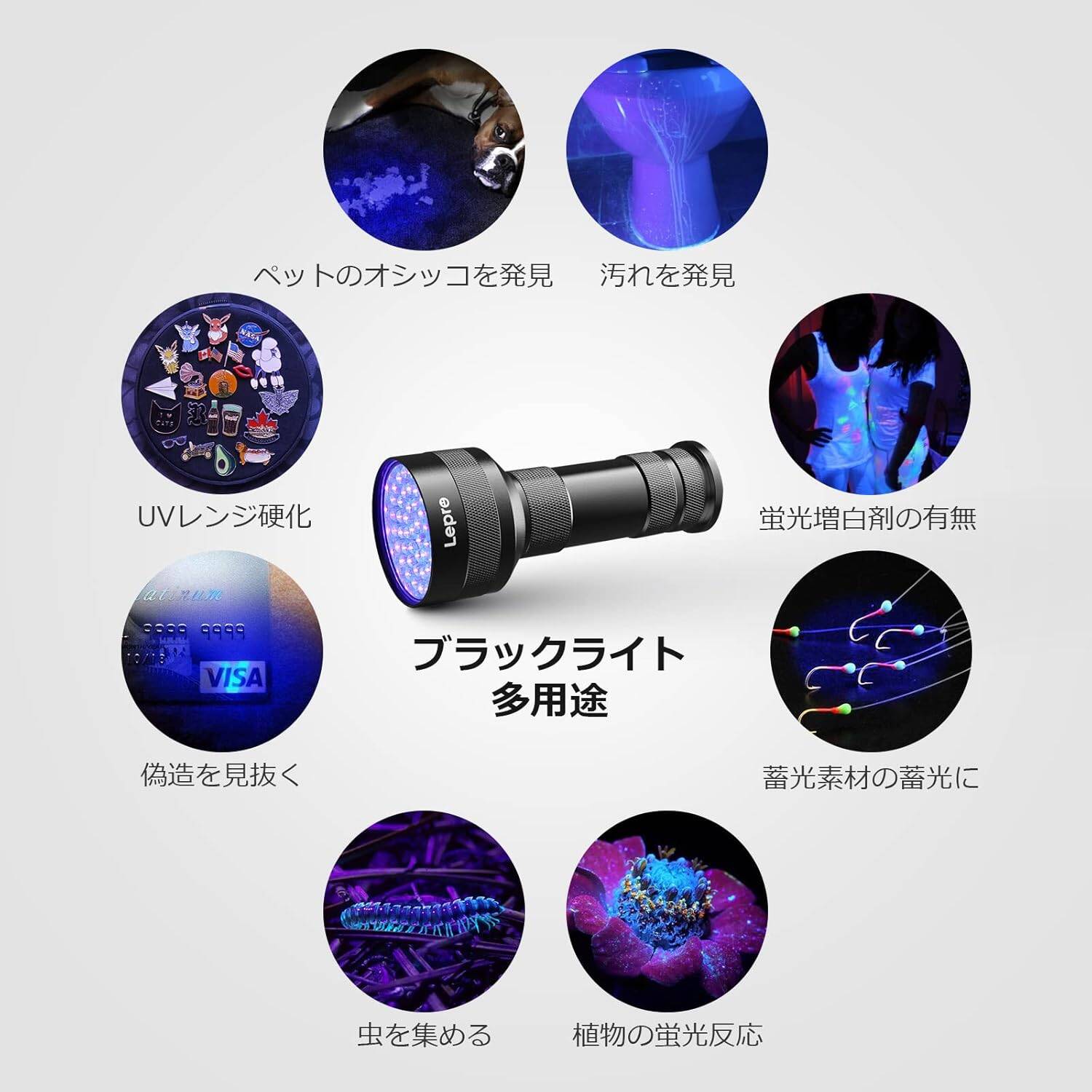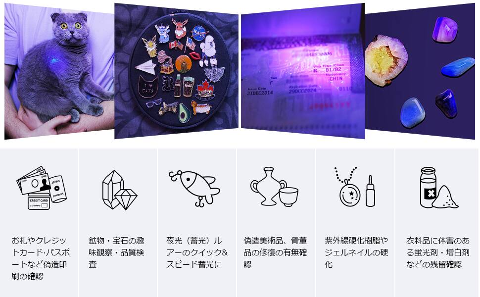 - 【様々なシーンで活躍】紫外線ライトとして、化粧品や日用品の蛍光検出、UVレジン硬化、夜間の釣り用の照明、偽造印刷物の確認、郵便検査、精密機器の埃チェック、蓄光素材への蓄光、鉱物・宝石の確認、機械のオイル漏れ点検、歯科検診など…