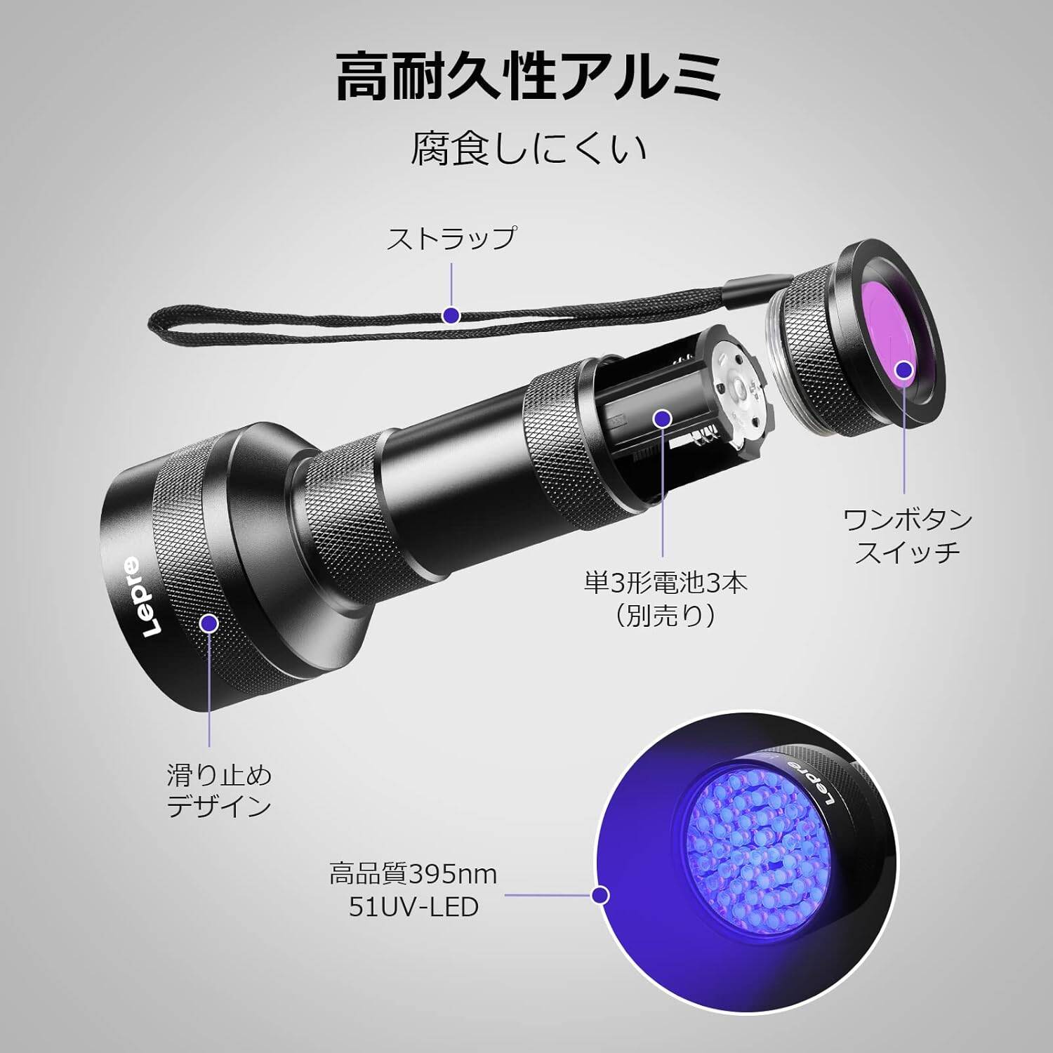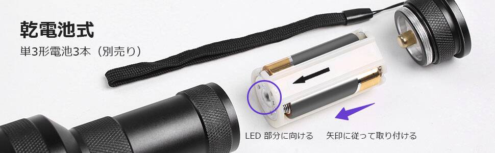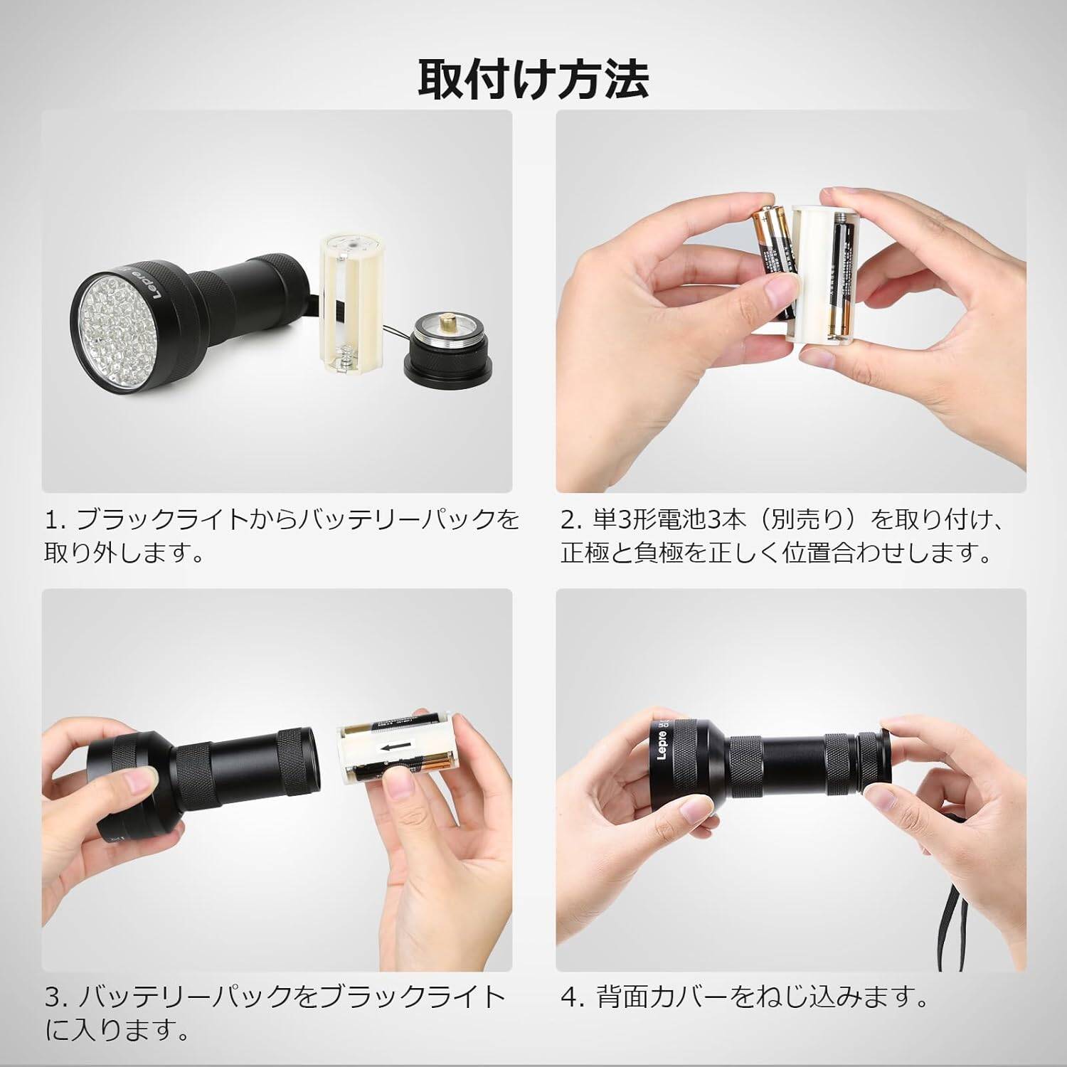 - 【取扱上の注意】Leproブラックライトは、単3形電池を3本使用します。製品には電池が付属していないため、ご自身でご用意いただく必要があります。●電池を電池パックに取り付ける際は、電池パックの両端にあるプラス極とマイナス極の指示に従ってください。●電池パックを本体に取り付ける際は、電池パックの矢印がLED部分の方向を向くように装着してください。