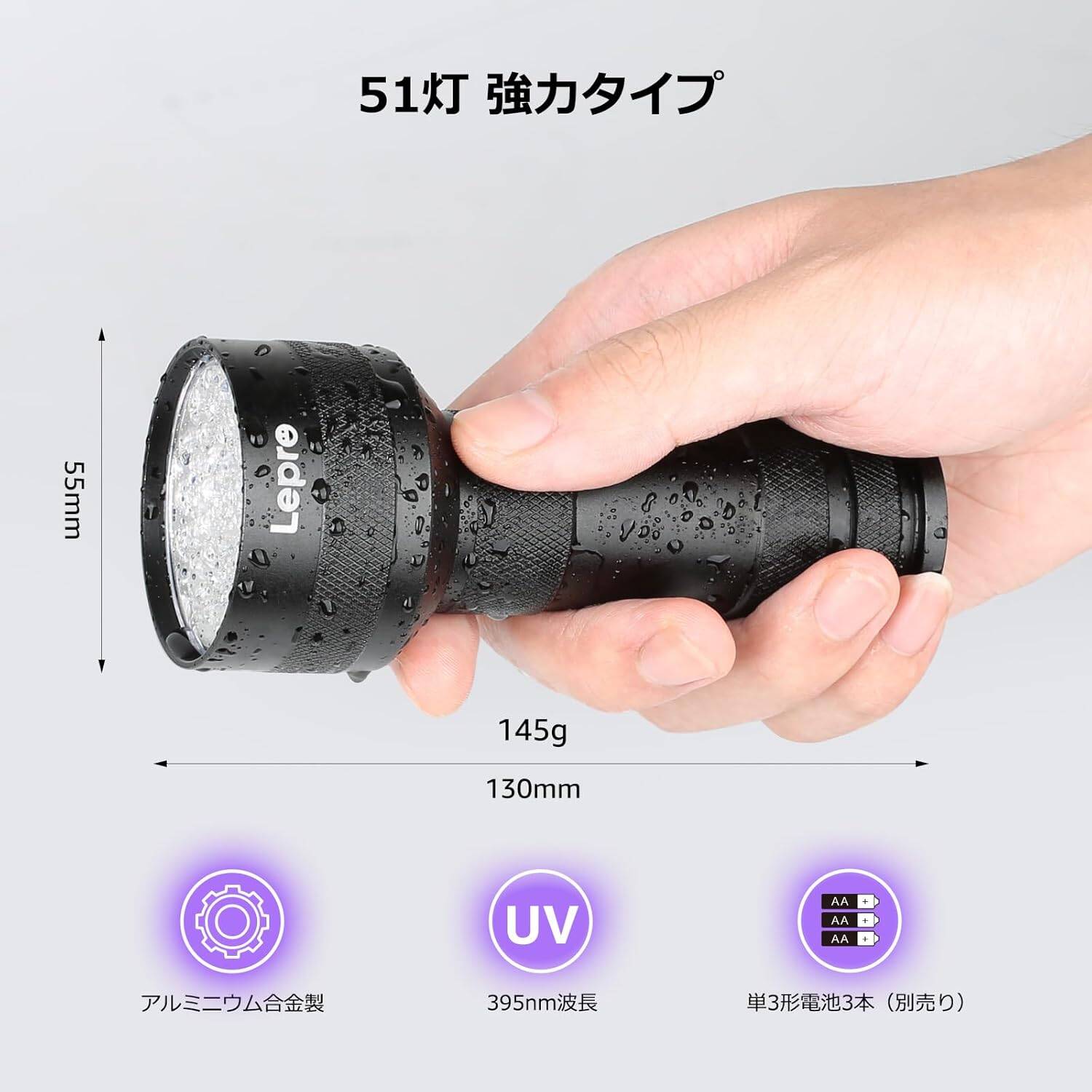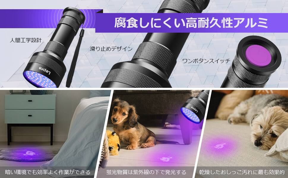 Lepro ブラックライト led 紫外線ライト 51LED 高出力タイプ UVライト レジン用 硬化ライト 紫外線 395nm アルミ合金材質 レジン用硬化ライト/ペットのオシッコ/見えない汚れのチェック/トイレ掃除/蓄光素材への蓄光/鉱物宝石等の確認に [PR110018]