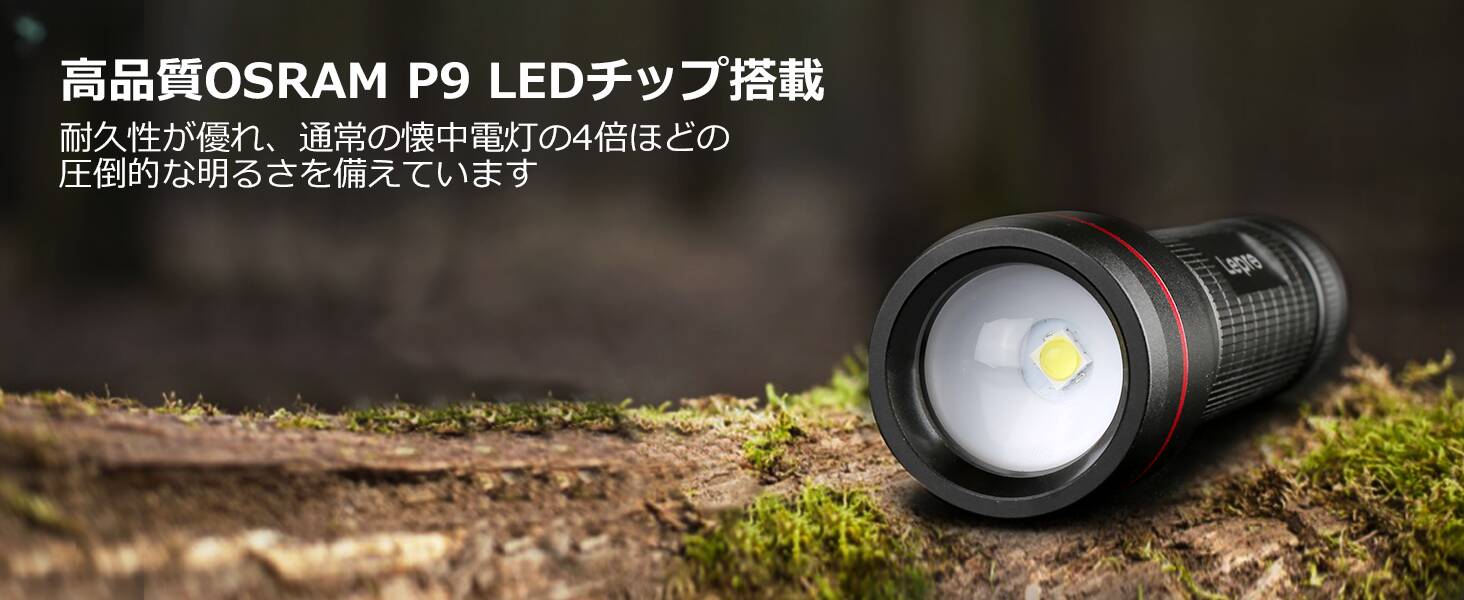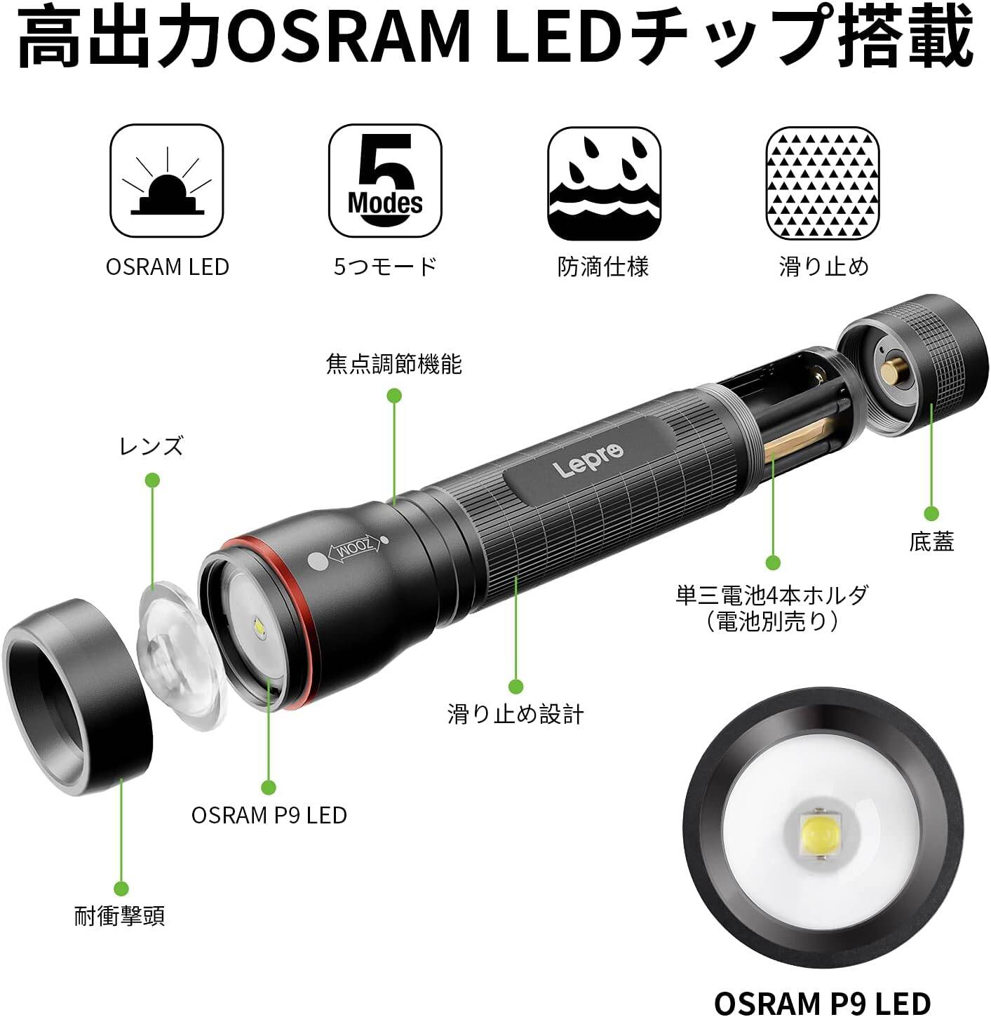 Lepro LED懐中電灯 OSRAM社製超高輝度LED搭載 単三電池対応 ハンディライト フラッシュライト 強力 軍用 【LE3000/超高輝度/ズーム式/5つ点灯モード/防滴】電池式 防災 停電対策 緊急用 新型 軽量 キャンプ 登山 夜釣り[PR120029]
