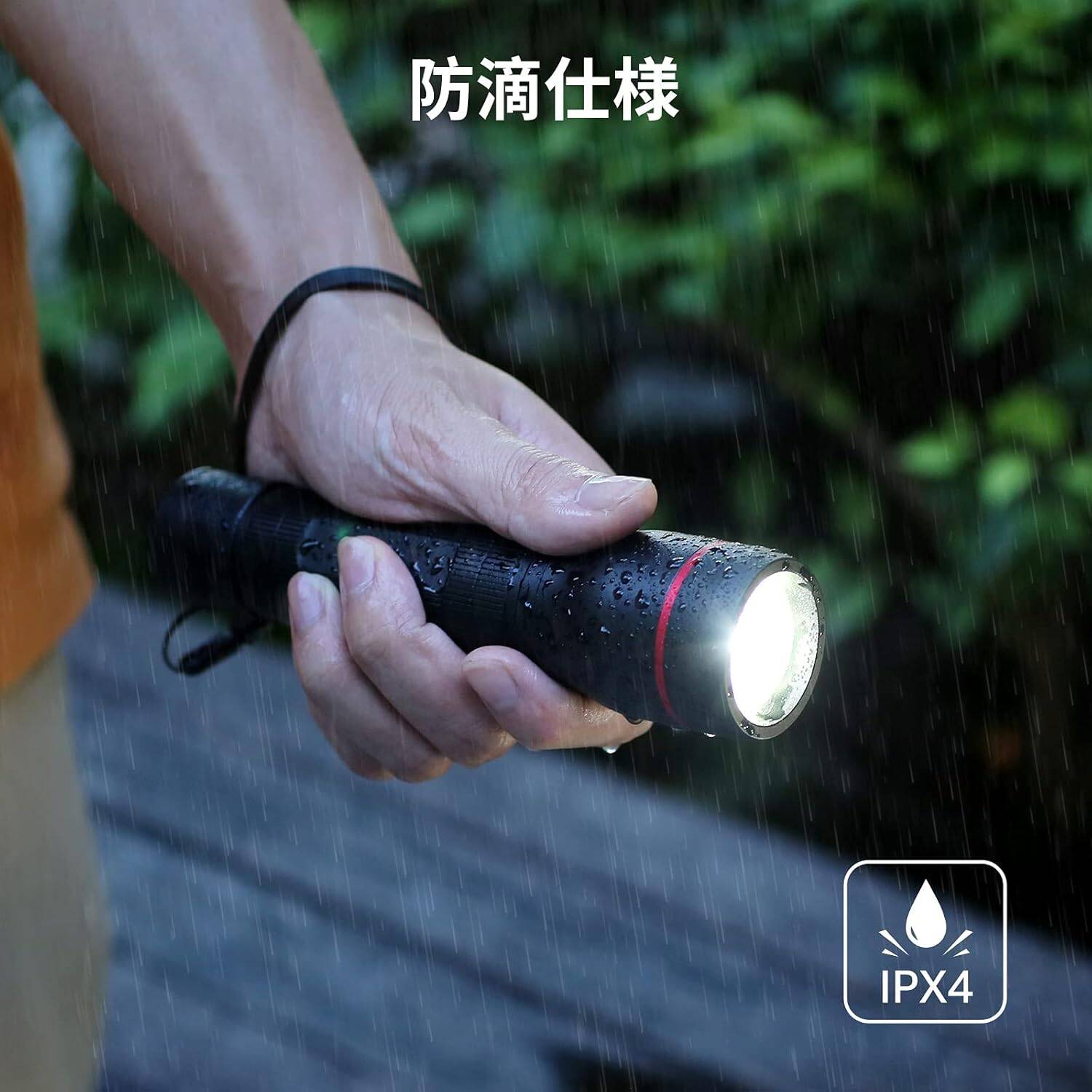 - 【防滴仕様】防水等級IPX4に準拠しているので、日常生活における雨水などによる水滴の付着や水しぶきにも耐えられ、懐中電灯本体に悪影響を与えません。夜に自転車、散歩、キャンプ、アウトドア時に突然の雨が降りだしても心配する必要はありません。