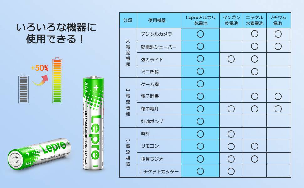 リモコン、携帯ラジオ、電動歯ブラシ、乾電池シェーバー、コードレス理美容機器、ワイヤレスマウス、電池式おもちゃ、電卓、体重計、温度計などの普段使いはもちろん、長時間保存可能だから、LED懐中電灯、LEDランタン、LEDヘッドライトなどの防災用ストックにもおすすめします。