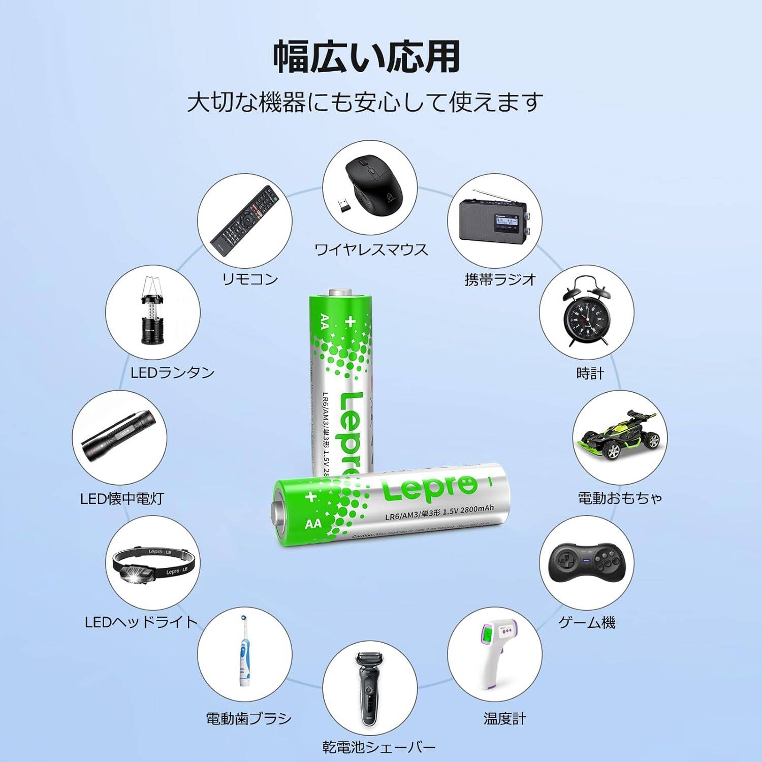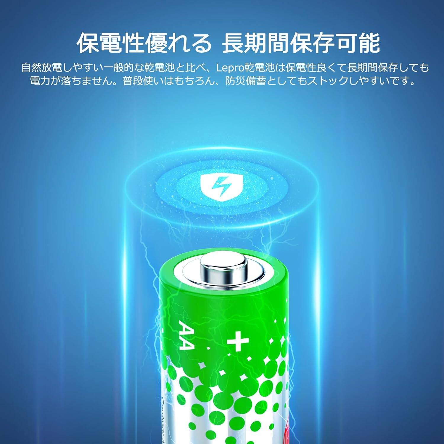 リモコン、携帯ラジオ、電動歯ブラシ、乾電池シェーバー、コードレス理美容機器、ワイヤレスマウス、電池式おもちゃ、電卓、体重計、温度計などの普段使いはもちろん、長時間保存可能だから、LED懐中電灯、LEDランタン、LEDヘッドライトなどの防災用ストックにもおすすめします。