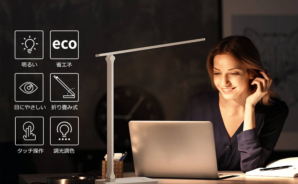 - 【タッチセンサー搭載・簡単に調節可能】指先でほんの少し触れるだけで、オン・オフが簡単に調節できるタッチセンサーを搭載しています。明るさや色温度も、手軽に調節できます。使いやすさと豊富な調色調光機能が特長で、勉強や読書、常夜灯として幅広く活用できます。また、贈り物としても最適です。