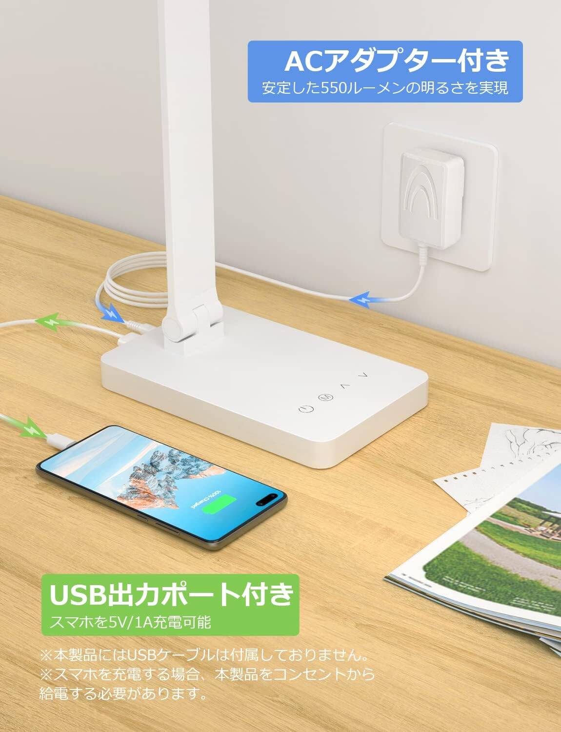 Lepro デスクライト led 目に優しい 電気スタンド ACアダプター付き 明るさ550ルーメン スタンドライト 卓上ライト おしゃれ 【5段階明るさ/電球色・白色・昼光色/タッチセンサー操作/調光調色/照明とデバイス充電を両立/多角度調整/コンセント付き】 卓上 勉強 机 ライト 明るい 読書灯 台灯 ブックライト (ホワイト) [PR310003-DWW-JP]
