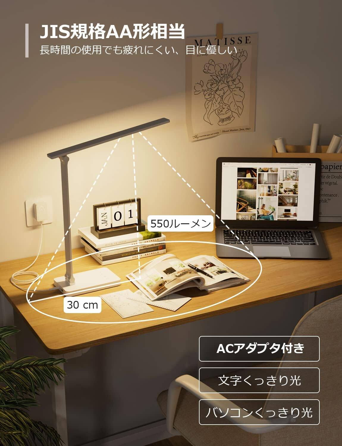 Leproデスクライトは、「ライト部分の横幅は約31cmで、光束は550ルーメン」あり、JIS規格のAA型に相当します。