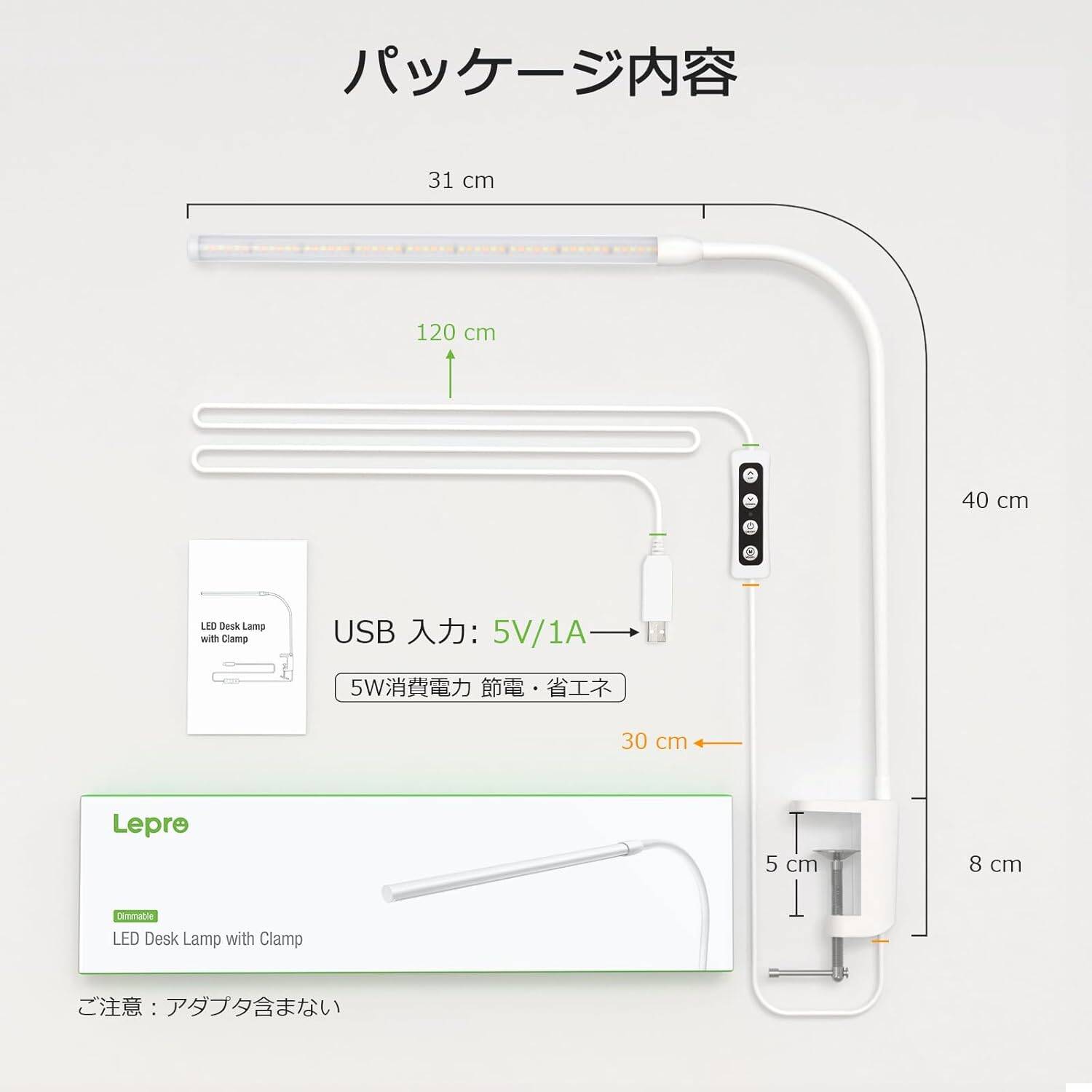 - 【USB給電・省エネ】デスクライトはUSB-Aポートに電源アダプタを接続するだけですぐに点灯します。高輝度ledチップを採用しており、消費電力は僅か5Wです。LEDライト自体の発熱も抑えられ、子供でも安心してご利用いただけます。メーカーより24ヶ月の保証が付きますので、ご安心くださいませ。