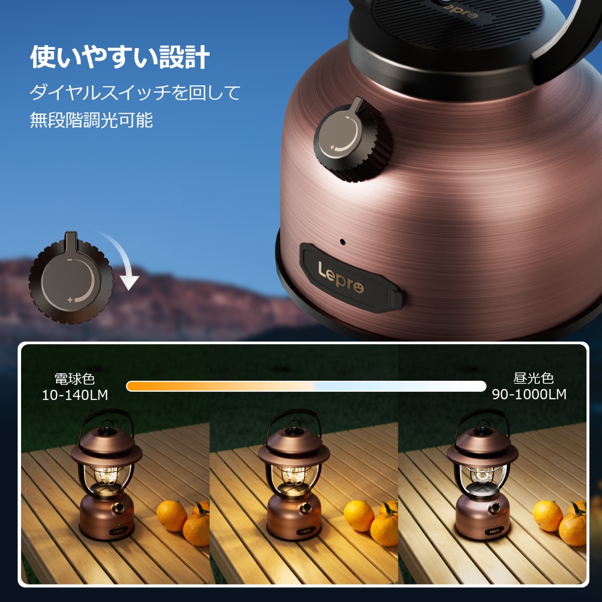 暖かみのある雰囲気にしたい場合は電球色、テントの中で読書と調理などの作業をする場合は昼光色をお選びください!ダイヤルスイッチを回すことで無段階調光ができるため、シーンやその時の気分に合わせて自由自在に調節でき、自分だけの最高の雰囲気を作り出せます。