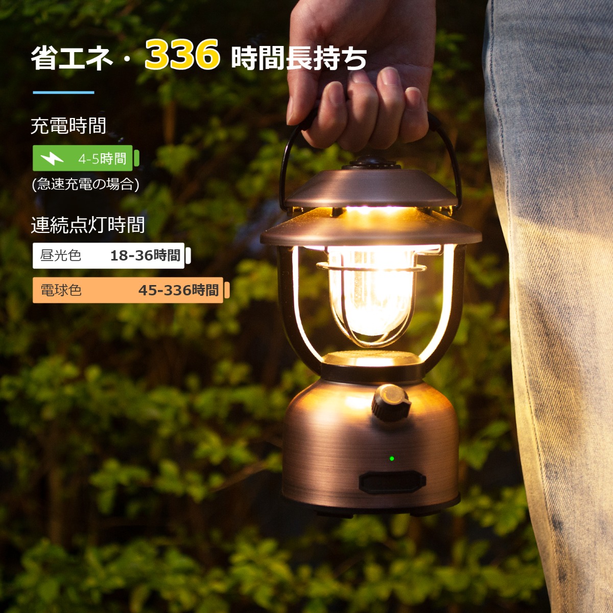 - 【おしゃれでレトロなLEDランタン・336時間長持ち】照らしすぎず落ち着いた雰囲気を味わえ、どこか懐かしい気持ちにさせてくれるレトロ調のおしゃれなLEDランタンです。シンプルでクラシックなデザインは、洋風や和風の場所を問わず様々な雰囲気に溶け込みます。15000mAh超大容量バッテリーを搭載しており、実用点灯時間は18~336時間に達します。キャンプライト、テーブルライトやナイトライトなどお好みに合わせて雰囲気作りの照明としてはもちろん、防災用にも最適です。