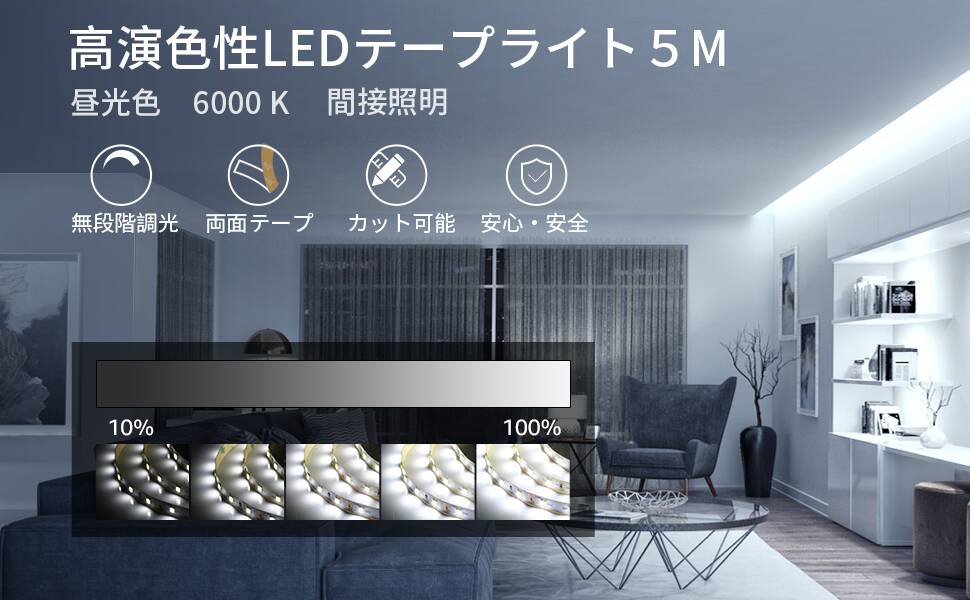 - 【高演色性・間接照明】5mのLEDテープ基板に、高演色2835SMDチップを300個も使っており、明るく、鮮やかな白色再現が可能なテープLEDです。店舗、住宅の間接照明や什器照明に使えて、高級感ある広い空間を演出することができます。