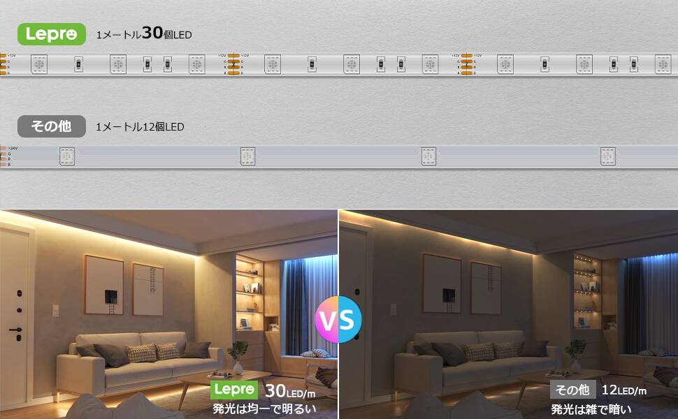 - 『適格請求書の発行対象商品』【LEDの数が多くてより明るいです!】10mの場合、ほかのメーカーはただ120個LEDが搭載され、暗くて耐久性が弱いです。Leproのledテープライトは、10mのLEDテープ基板に高演色5050SMDチップを300個ぐらい使っており、明るく、鮮やかな色再現が可能な高耐久LEDテープです。