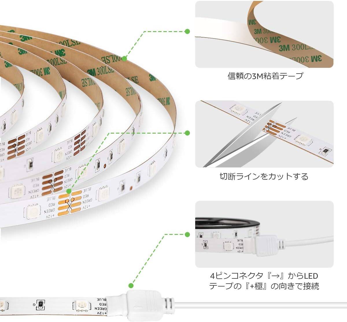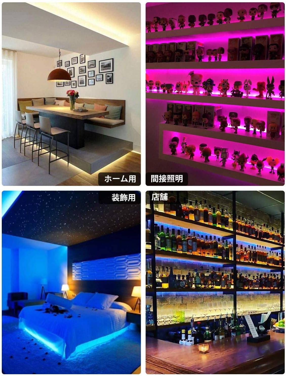 - 【簡単設置&切断可能】裏面には強力な3M両面テープが付いているため、取り付けが簡単です。柔軟性があるため自由に曲げることができ 、直線はもちろん、曲線のコーブ照明やコーニス照明にも適応します。キッチン、寝室 、食器棚、テレビ、パソコン、バーカウンターなどの装飾や、クリスマスの飾りとしても活躍します。LEDテープを剥がしても痕がつかない、賃貸の方にもお勧め!お好みの長さに切断でき、自由自在にDIY可能!『ご注意:切断すると残った部分はコネクター(別売り)がないと再利用できないことを予めご了承下さい』