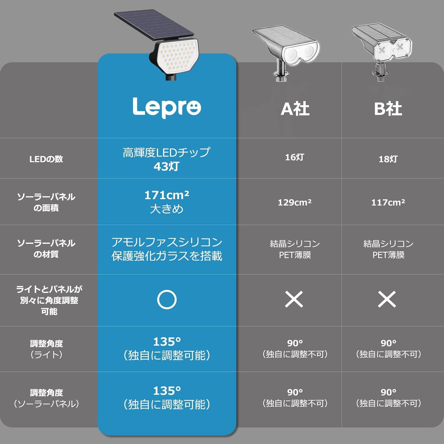 ●新たに改良した電子回路基板と光の吸収力が高いアモルファスシリコン素材のソーラーパネルを採用。さらにパネル表面に保護強化ガラスを搭載し、耐水性を高め、皮むけや経年劣化を効果的に防止できます。日当たりに合わせて角度の調整も可能なので一体型のものより便利です。