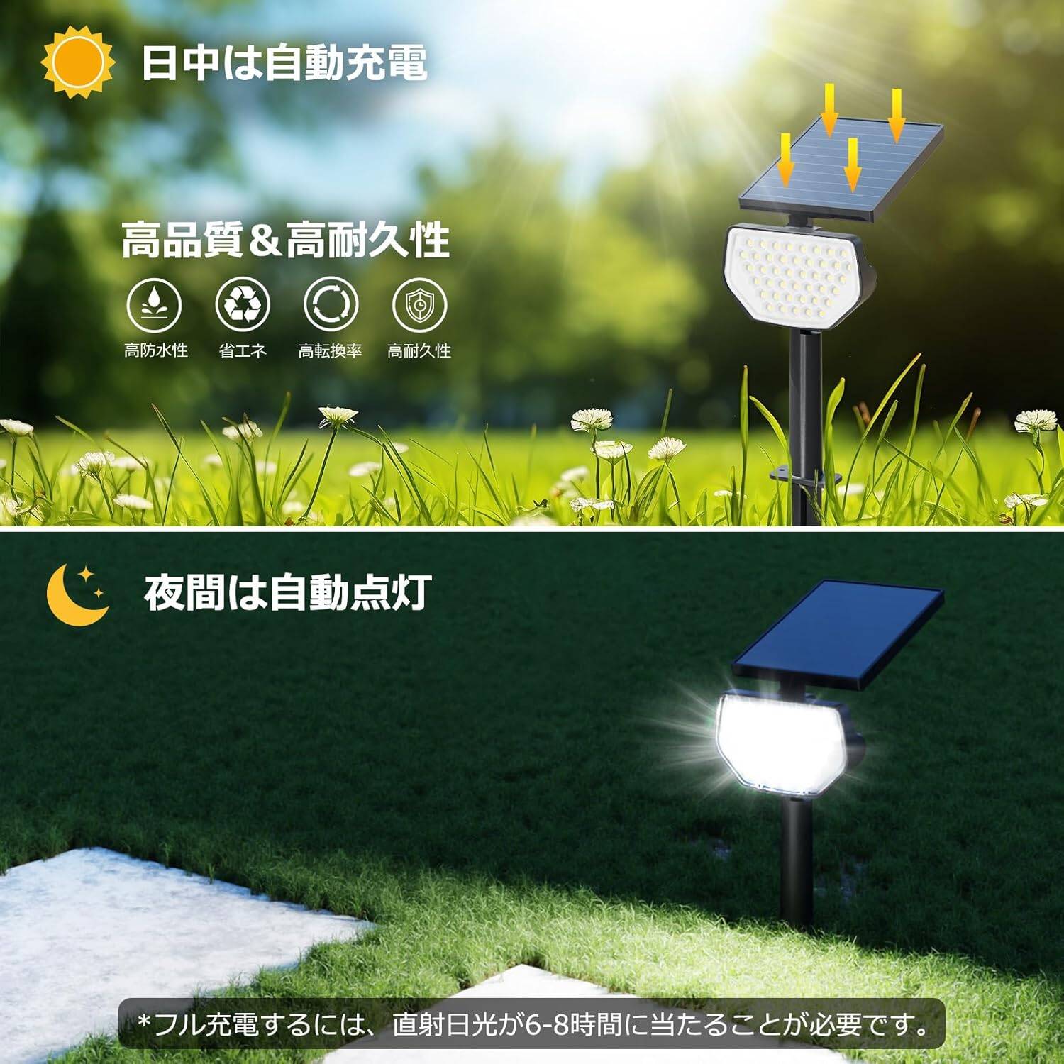 ●光センサーが搭載され、日中は自動的に消灯してソーラーパネルによって充電され、夜間は自動的に点灯します。日光を浴びると自動的に消灯します。