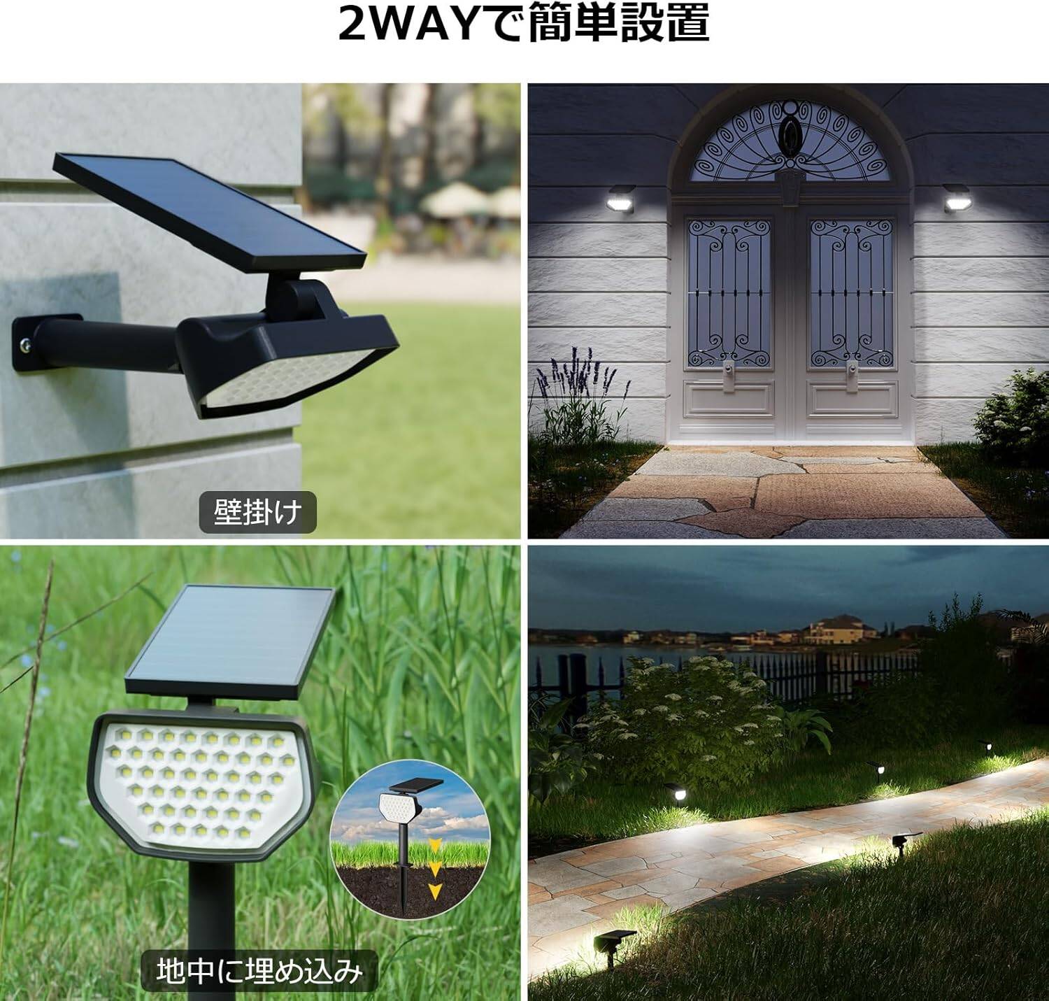 - 【埋め込み・壁掛け2WAYタイプ】地面に差し込む、もしくは壁に固定するという2つの取り付け方法があり、環境や用途に合わせて選べます。埋め込み部分は取り外しできるので、置き型としても設置可能。一度スイッチをONにするだけで、日中の太陽光で充電され、省エネで電気代も一切不要です。玄関先や庭に設置するLED投光器としてもおすすめです
