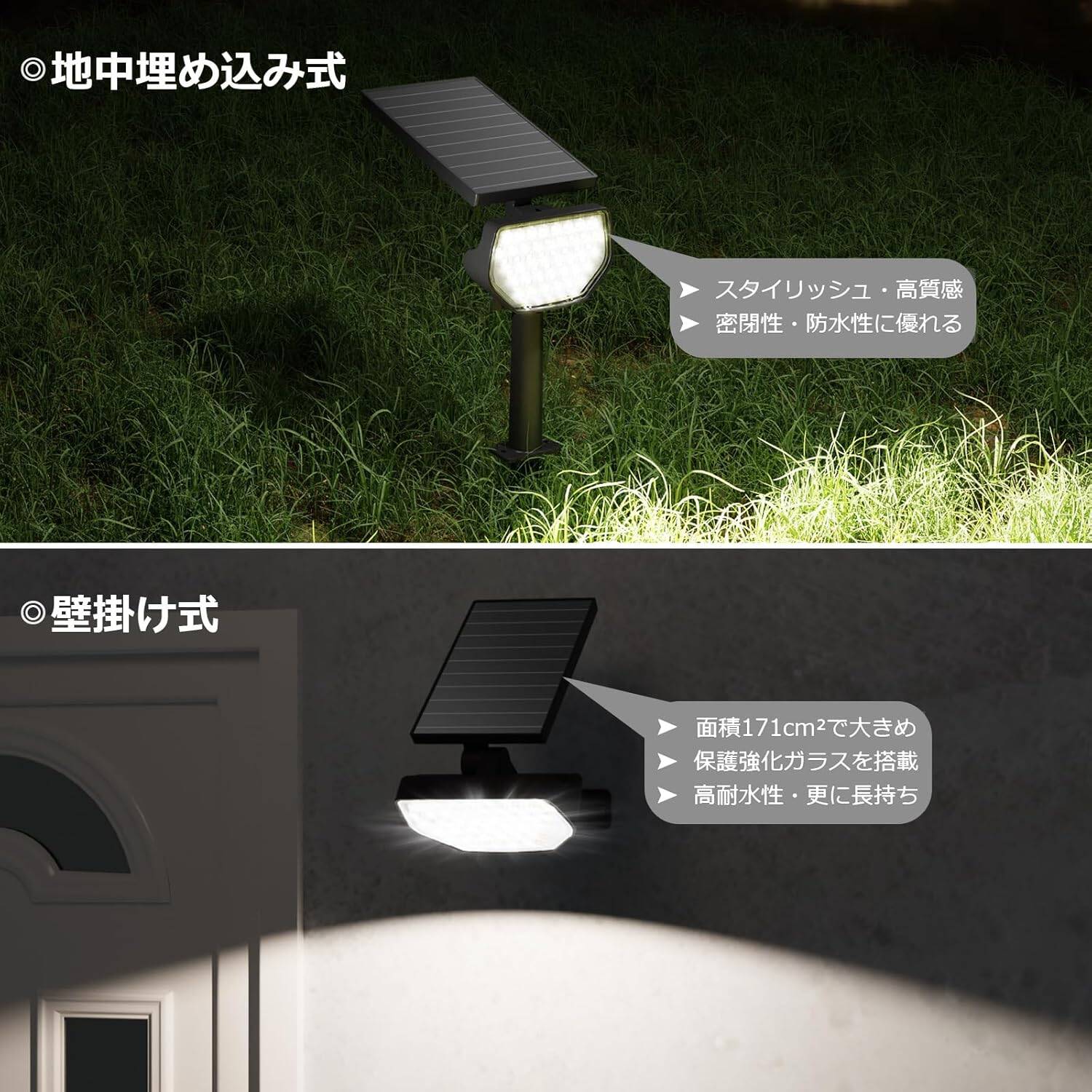 スタイリッシュ・高質感:配線や基盤が外から一切見えないようにスッキリとした高品質の作りです。完成度が高く、一体感が感じられ、スタイリッシュで質感がいい。製品全体はしっかり密閉されていて、防水性能をさらに高めるように仕上げられています。ソーラーパネルも大きく、おまけに保護ガラスに覆われ、耐久性に優れてさらに長持ちします。