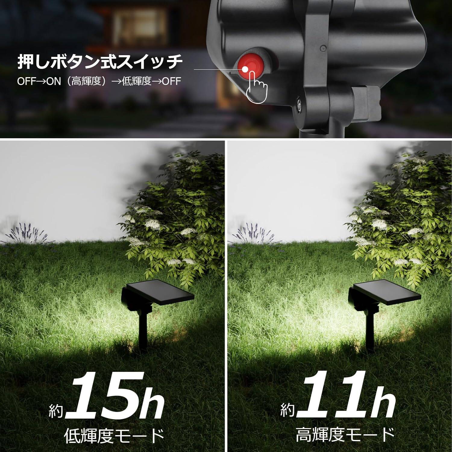 *直射日光に8時間の充電で、11~15時間照明できます。当日の天気や充電時間に関係がありますので、充電時間不足なら、点灯時間も短くなります。