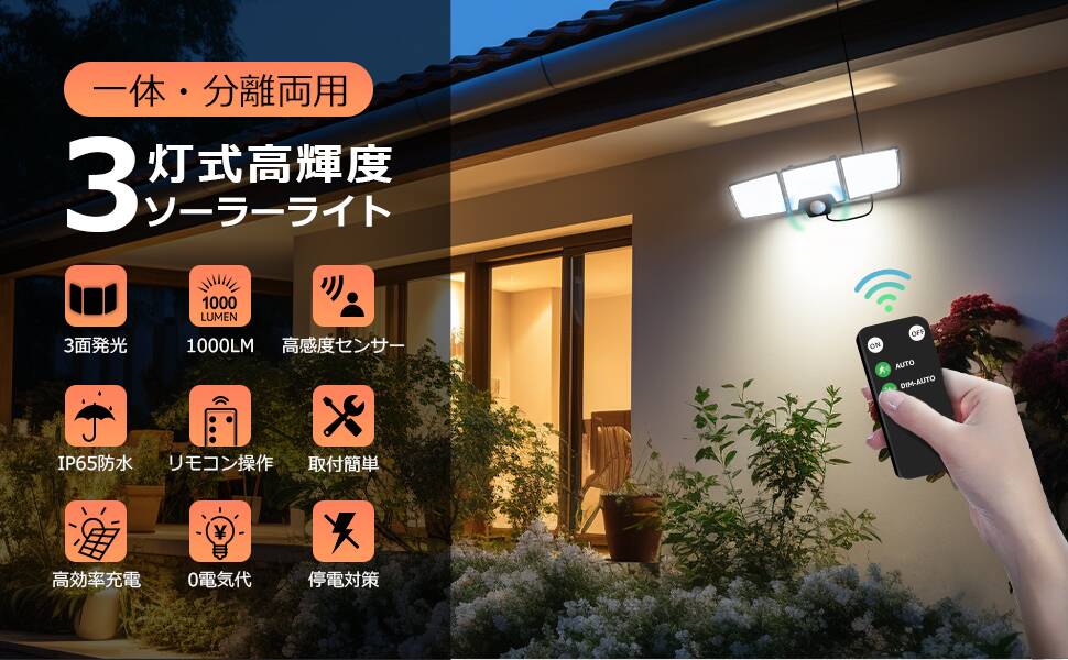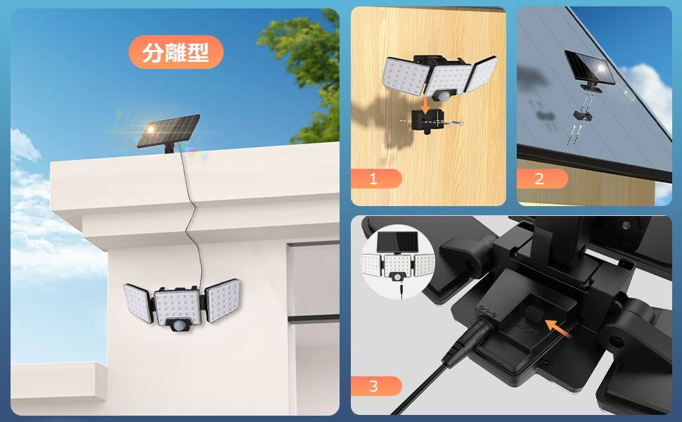 - 【超高輝度センサーライト:一体型・分離型両用可能】Leproセンサーライトは、昼光色6500Kの超高輝度LEDチップを搭載し、1000ルーメンの高輝度は暗闇の中でも圧倒的で、まるで昼間のように鮮明で、安心で安全な環境を提供します。また、一体型として使用することはもちろん、付属のケーブルでソーラーパネルとライト本体を最大3メートル離れた場所に分離して設置することもできます。